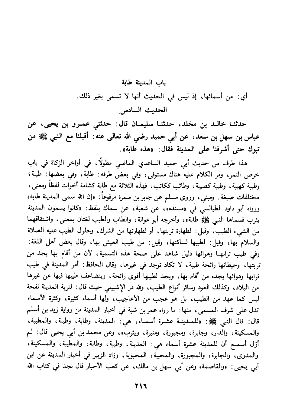حَدَّثَنَا خَالِدُ بْنُ مَخْلَدٍ، حَدَّثَنَا سُلَيْمَانُ قَالَ: حَدَّثَنِي عَمْرُو بْنُ يَحْيَى، عَنْ عَبَّاسِ بْنِ سَهْلِ بْنِ سَعْدٍ، عَنْ أَبِي حُمَيْدٍ رضي الله عنه: أَقْبَلْنَا مَعَ النَّبِيِّ -صلى الله عليه وسلم- مِنْ تَبُوكَ حَتَّى أَشْرَفْنَا عَلَى الْمَدِينَةِ فَقَالَ: "هَذِهِ طَابَةُ".