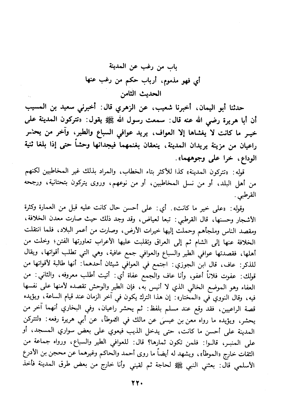 وقوله: "على خير ما كانت". أي: على أحسن حال كانت عليه قبل من العمارة وكثرة الأشجار وحسنها، قال القرطبي: تبعًا لعياض، وقد وجد ذلك حيث صارت معدن الخلافة، ومقصد الناس وملجأهم وحملت إليها خيرات الأرض، وصارت من أعمر البلاد، فلما انتقلت الخلافة عنها إلى الشام ثم إلى العراق وتقلبت عليها الأعراب تعاورتها الفتن؛ وخلت من أهلها، فقصدتها عوافي الطير والسباع والعوافي جمع عافية، وهي التي تطلب أقواتها، ويقال للذكر: عاف، قال ابن الجوزي: اجتمع في العوافي شيئان أحدهما: أنها طالبة لأقواتها من قولك: عفوت فلانًا أعفو، وأنا عاف والجمع عفاة أي: أتيت أطلب معروفه، والثاني: من العفاء وهو الموضع الخالي الذي لا أنيس به، فإن الطير والوحش تقصده لأمنها على نفسها فيه، وقال النووي في "المختار": إن هذا الترك يكون في آخر الزمان عند قيام الساعة، ويؤيده قصة الراعيين، فقد وقع عند مسلم بلفظ: ثم يحشر راعيان، وفي البخاري أنهما آخر من يحشر، ويؤيده ما رواه معن بن عيسى عن مالك في الموطأ، عن أبي هريرة رفعه: "لتتركن المدينة على أحسن ما كانت، حتى يدخل الذيب فيعوي على بعض سواري المسجد، أو على المنبر، قالوا: فلمن تكون ثمارها؟ قال: للعوافي الطير والسباع، ورواه جماعة من الثقات خارج "الموطأ"، ويشهد له أيضًا ما روى أحمد والحاكم وغيرهما عن محجن بن الأدرع الأسلمي قال: بعثني النبي -صلى الله عليه وسلم- لحاجة ثم لقيني وأنا خارج من بعض طرق المدينة فأخذ