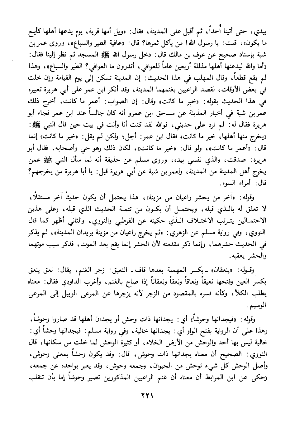 بيدي، حتى أتينا أُحدًا، ثم أقبل على المدينة، فقال: "ويل أمها قرية، يوم يدعها أهلها كأينع ما يكون"، قلت: يا رسول الله! من يأكل ثمرها؟ قال: "عافية الطير والسباع"، وروى عمر بن شبة بإسناد صحيح عن عوف بن مالك قال: دخل رسول الله -صلى الله عليه وسلم- المسجد ثم نظر إلينا فقال: "أما والله ليدعنها أهلها مذللة أربعين عامًا للعوافي، أتدرون ما العوافي؟ الطير والسباع"، وهذا لم يقع قطعًا، وقال المهلب في هذا الحديث: إن المدينة تسكن إلى يوم القيامة وإن خلت في بعض الأوقات، لقصد الراعيين بغنمهما المدينة، وقد أنكر ابن عمر على أبي هريرة تعبيره في هذا الحديث بقوله: "خير ما كانت" وقال: إن الصواب: أعمر ما كانت، أخرج ذلك عمر بن شبة في أخبار المدينة عن مساحق ابن عمرو أنه كان جالسًا عند ابن عمر فجاء أبو هريرة فقال له: لم ترد على حديثي، فوالله لقد كنت أنا وأنت في بيت حين قال النبي -صلى الله عليه وسلم-: "يخرج منها أهلها، خير ما كانت" فقال ابن عمر: أجل؛ ولكن لم يقل: "خير ما كانت" إنما "قال: "أعمر ما كانت"، ولو قال: "خير ما كانت"، لكان ذلك وهو حي وأصحابه، فقال أبو هريرة: صدقت، والذي نفسي بيده، وروى مسلم عن حذيفة أنه لما سأل النبي -صلى الله عليه وسلم- عمن يخرج أهل المدينة من المدينة، ولعمر بن شبة عن أبي هريرة قيل: يا أبا هريرة من يخرجهم؟ قال: أمراء السوء.