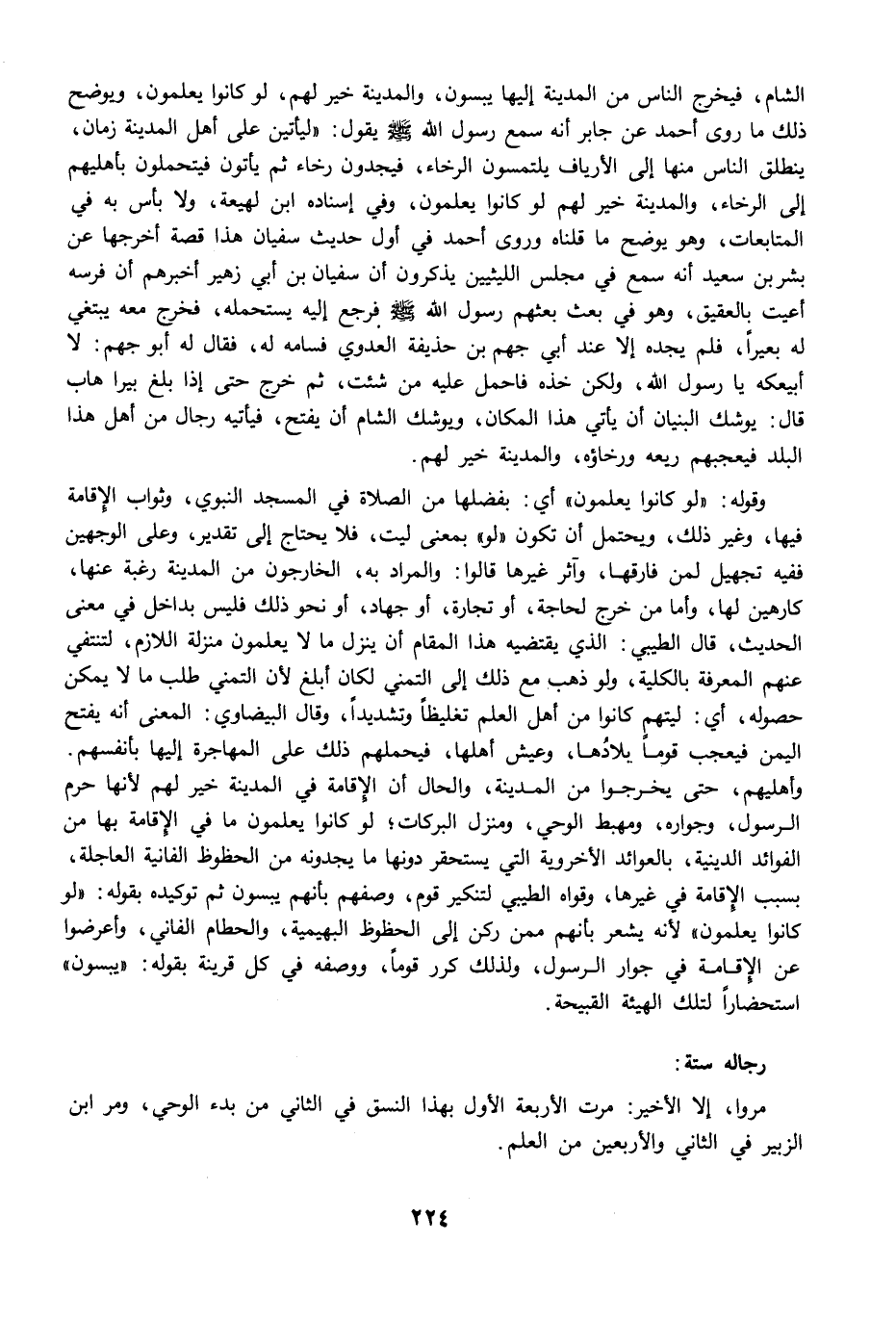 الشام، فيخرج الناس من المدينة إليها يبسون، والمدينة خير لهم، لو كانوا يعلمون، ويوضح ذلك ما روى أحمد عن جابر أنه سمع رسول الله -صلى الله عليه وسلم- يقول: "ليأتين على أهل المدينة زمان، ينطلق الناس منها إلى الأرياف يلتمسون الرخاء، فيجدون رخاء ثم يأتون فيتحملون بأهليهم إلى الرخاء، والمدينة خير لهم لو كانوا يعلمون، وفي إسناده ابن لهيعة، ولا بأس به في المتابعات، وهو يوضح ما قلناه وروى أحمد في أول حديث سفيان هذا قصة أخرجها عن بشر بن سعيد أنه سمع في مجلس الليثيين يذكرون أن سفيان بن أبي زهير أخبرهم أن فرسه أعيت بالعقيق، وهو في بعث بعثهم رسول الله -صلى الله عليه وسلم- فرجع إليه يستحمله، فخرج معه يبتغي له بعيرًا، فلم يجده إلا عند أبي جهم بن حذيفة العدوي فسامه له، فقال له أبو جهم: لا أبيعكه يا رسول الله، ولكن خذه فاحمل عليه من شئت، ثم خرج حتى إذا بلغ بيرا هاب قال: يوشك البنيان أن يأتي هذا المكان، ويوشك الشام أن يفتح، فيأتيه رجال من أهل هذا البلد فيعجبهم ريعه ورخاؤه، والمدينة خير لهم.