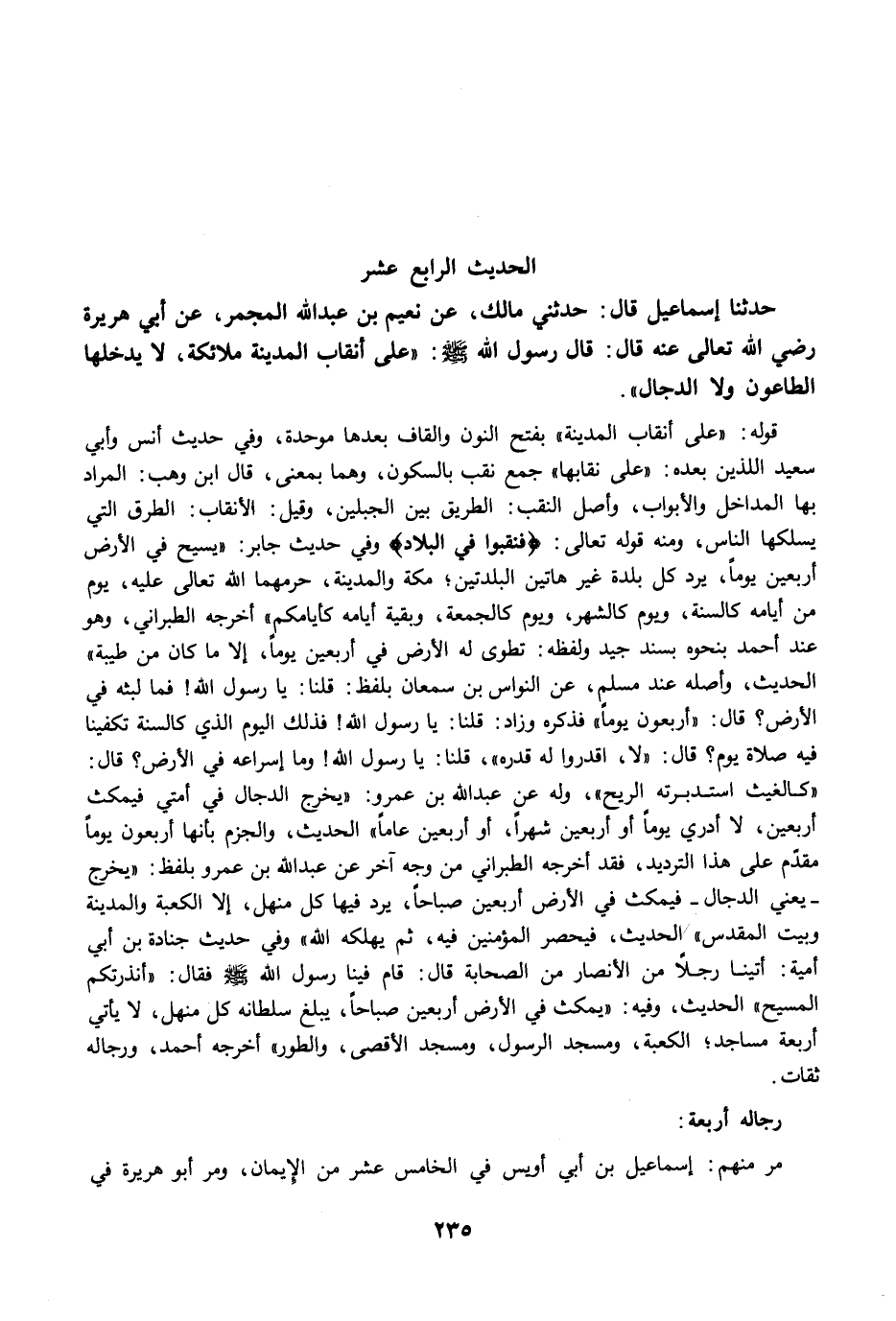 حَدَّثَنَا إِسْمَاعِيلُ قَالَ: حَدَّثَنِي مَالِكٌ، عَنْ نُعَيْمِ بْنِ عَبْدِ اللَّهِ الْمُجْمِرِ، عَنْ أَبِي هُرَيْرَةَ رضي الله عنه قَالَ: قَالَ رَسُولُ اللَّهِ -صلى الله عليه وسلم-: "عَلَى أَنْقَابِ الْمَدِينَةِ مَلاَئِكَةٌ، لاَ يَدْخُلُهَا الطَّاعُونُ وَلاَ الدَّجَّالُ".
