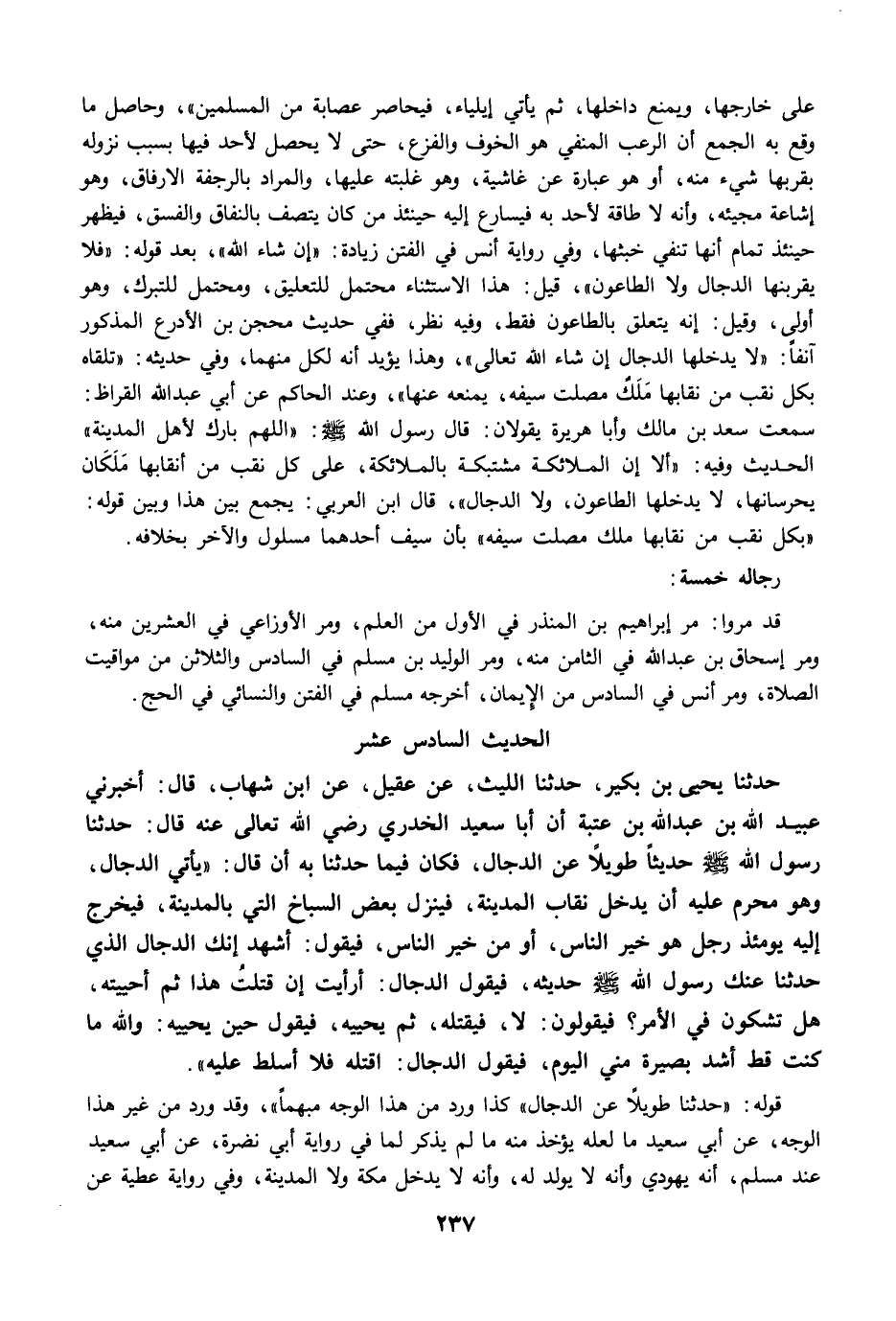 حَدَّثَنَا يَحْيَى بْنُ بُكَيْرٍ، حَدَّثَنَا اللَّيْثُ، عَنْ عُقَيْلٍ، عَنِ ابْنِ شِهَابٍ، قَالَ: أَخْبَرَنِي عُبَيْدُ اللَّهِ بْنُ عَبْدِ اللَّهِ بْنِ عُتْبَةَ أَنَّ أَبَا سَعِيدٍ الْخُدْرِيَّ رضي الله عنه قَالَ: حَدَّثَنَا رَسُولُ اللَّهِ -صلى الله عليه وسلم- حَدِيثًا طَوِيلاً عَنِ الدَّجَّالِ، فَكَانَ فِيمَا حَدَّثَنَا بِهِ أَنْ قَالَ: "يَأْتِي الدَّجَّالُ، وَهُوَ مُحَرَّمٌ عَلَيْهِ أَنْ يَدْخُلَ نِقَابَ الْمَدِينَةِ، بَعْضَ السِّبَاخِ الَّتِي بِالْمَدِينَةِ، فَيَخْرُجُ إِلَيْهِ يَوْمَئِذٍ رَجُلٌ، هُوَ خَيْرُ النَّاسِ، أَوْ مِنْ خَيْرِ النَّاسِ، فَيَقُولُ: أَشْهَدُ أَنَّكَ الدَّجَّالُ، الَّذِي حَدَّثَنَا عَنْكَ رَسُولُ اللَّهِ -صلى الله عليه وسلم- حَدِيثَهُ، فَيَقُولُ الدَّجَّالُ: أَرَأَيْتَ إِنْ قَتَلْتُ هَذَا ثُمَّ أَحْيَيْتُهُ، هَلْ تَشُكُّونَ فِي الأَمْرِ؟ فَيَقُولُونَ: لاَ. فَيَقْتُلُهُ، ثُمَّ يُحْيِيهِ فَيَقُولُ حِينَ يُحْيِيهِ: وَاللَّهِ مَا كُنْتُ قَطُّ أَشَدَّ بَصِيرَةً مِنِّي الْيَوْمَ، فَيَقُولُ الدَّجَّالُ: أَقْتُلُهُ فَلاَ أُسَلَّطُ عَلَيْهِ".