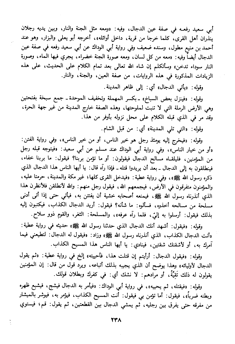 أبي سعيد رفعه في صفة عين الدجال، وفيه: "ومعه مثل الجنة والنار، وبين يديه رجلان ينذران أهل القرى، كلما خرجا من قرية، داخل أوائله"، أخرجه أبو يعلى والبزار، وهو عند أحمد بن منيع مطول، وسنده ضعيف وفي رواية أبي الوداك عن أبي سعيد رفعه في صفة عين الدجال أيضًا وفيه: "معه من كل لسان، ومعه صورة الجنة خضراء، يجري فيها الماء، وصورة النار سوداء تدخن" وسأتكلم ان شاء الله تعالى بعد تمام الكلام على الحديث، على هذه الزيادات المذكورة في هذه الروايات، من صفة العين، والجنة، والنار.