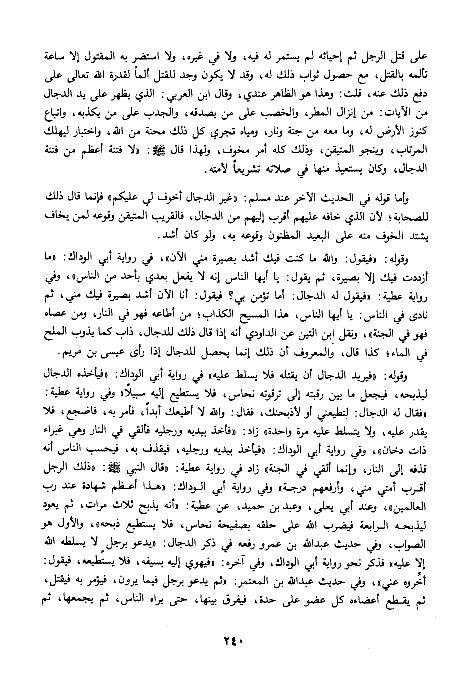 على قتل الرجل ثم إحياثه لم يستمر له فيه، ولا في غيره، ولا استضر به المقتول إلا ساعة تألمه بالقتل، مع حصول ثواب ذلك له، وقد لا يكون وجد للقتل ألمًا لقدرة الله تعالى علي دفع ذلك عنه، قلت: وهذا هو الظاهر عندي، وقال ابن العربي: الذي يظهر على يد الدجال من الآيات: من إنزال المطر، والخصب على من يصدقه، والجدب على من يكذبه، واتباع كنوز الأرض له، وما معه من جنة ونار، ومياه تجري كل ذلك محنة من الله، واختبار ليهلك المرتاب، وينجو المتيقن، وذلك كله أمر مخوف، ولهذا قال -صلى الله عليه وسلم-: "لا فتنة أعظم من فتنة الدجال، وكان يستعيذ منها في صلاته تشريعًا لأمته.