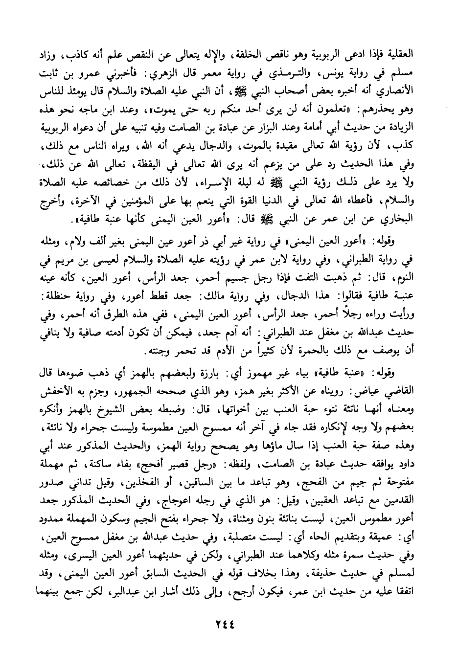 العقلية فإذا ادعى الربوبية وهو ناقص الخلقة، والإله يتعالى عن النقص علم أنه كاذب، وزاد مسلم في رواية يونس، والترمذي في رواية معمر قال الزهري: فأخبرني عمرو بن ثابت الأنصاري أنه أخبره بعض أصحاب النبي -صلى الله عليه وسلم-، أن النبي عليه الصلاة والسلام قال يومئذ للناس وهو يحذرهم: "تعلمون أنه لن يرى أحد منكم ربه حتى يموت"، وعند ابن ماجه نحو هذه الزيادة من حديث أبي أمامة وعند البزار عن عبادة بن الصامت وفيه تنبيه على أن دعواه الربوبية كذب، لأن رؤية الله تعالى مقيدة بالموت، والدجال يدعى أنه الله، ويراه الناس مع ذلك، وفي هذا الحديث رد على من يزعم أنه يرى الله تعالى في اليقظة، تعالى الله عن ذلك، ولا يرد على ذلك رؤية النبي -صلى الله عليه وسلم- له ليلة الإسراء، لأن ذلك من خصائصه عليه الصلاة والسلام، فأعطاه الله تعالى في الدنيا القوة التي ينعم بها على المؤمنين في الآخرة، وأخرج البخاري عن ابن عمر عن النبي -صلى الله عليه وسلم- قال: "أعور العين اليمنى كأنها عنبة طافية".