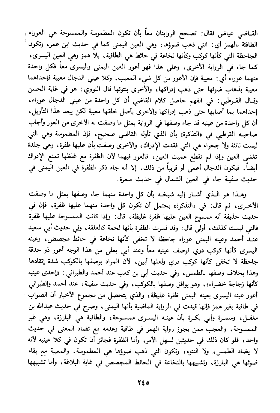 القاضي عياض فقال: تصحح الروايتان معًا بأن تكون المطموسة والممسوحة هي العوراء الطافئة بالهمز أي: التي ذهب ضوؤها، وهي العين اليمنى كما في حديث ابن عمر، وتكون الجاحظة التي كأنها كوكب وكأنها نخاعة في حائط هي الطافية، بلا همز وهي العين اليسرى، كما جاء في الرواية الأخرى، وعلى هذا فهو أعور العين اليمنى واليسرى معًا فكل واحدة منهما عوراء أي: معيبة فإن الأعور من كل شيء المعيب، وكلا عيني الدجال معيبة فإحداهما معيبة بذهاب ضوئها حتى ذهب إدراكها، والأخرى بنتوئها قال النووي: هو في غاية الحسن وقال القرطبي: في الفهم حاصل كلام القاضي أن كل واحدة من عيني الدجال عوراء، إحداهما بما أصابها حتى ذهب إدراكها والأخرى بأصل خلقها معيبة لكن يبعد هذا التأويل، أن كل واحدة من عينيه قد جاء وصفها في الرواية بمثل ما وصفت به الأخرى من العور وأجاب صاحبه القرطبي في "التذكرة" بأن الذي تأوله القاضي صحيح، فإن المطموسة وهي التي ليست ناتئة ولا جحراء هي التي فقدت الإدراك، والأخرى وصفت بأن عليها ظفرة، وهي جلدة تغشى العين وإذا لم تقطع عميت العين، فالعور فيهما لأن الظفرة مع غلظها تمنع الإدراك أيضًا، فيكون الدجال أعمى أو قريبًا من ذلك، إلا أنه جاء ذكر الظفرة في العين اليمنى في حديث سفينة جاء في العين الشمال في حديث سمرة.