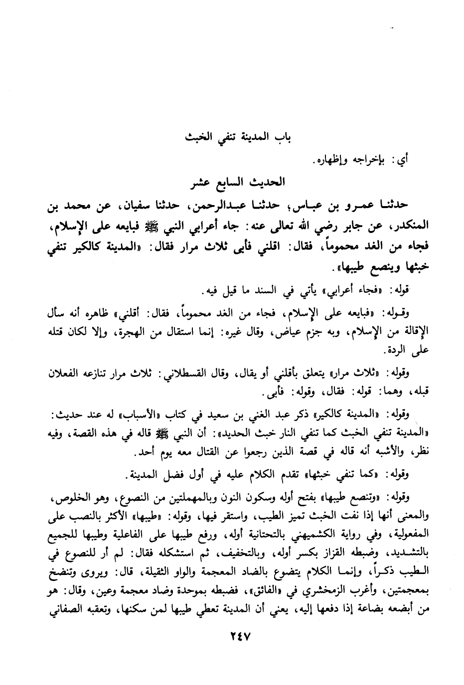 حَدَّثَنَا عَمْرُو بْنُ عَبَّاسٍ، حَدَّثَنَا عَبْدُ الرَّحْمَنِ، حَدَّثَنَا سُفْيَانُ، عَنْ مُحَمَّدِ بْنِ الْمُنْكَدِرِ، عَنْ جَابِرٍ رضي الله عنه: جَاءَ أَعْرَابِيٌّ النَّبِيَّ -صلى الله عليه وسلم- فَبَايَعَهُ عَلَى الإِسْلاَمِ، فَجَاءَ مِنَ الْغَدِ مَحْمُومًا، فَقَالَ: أَقِلْنِي، فَأَبَى ثَلاَثَ مِرَارٍ، فَقَالَ: "الْمَدِينَةُ كَالْكِيرِ، تَنْفِي خَبَثَهَا، وَيَنْصَعُ طَيِّبُهَا".