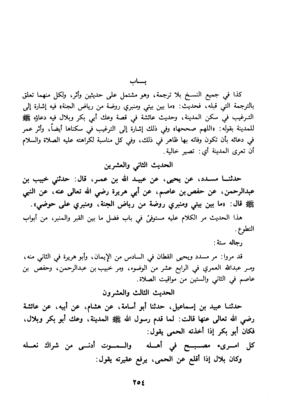 كذا في جميع النسخ بلا ترجمة، وهو مشتمل على حديثين وأثر، ولكل منهما تعلق بالترجمة التي قبله، فحديث: "ما بين بيتي ومنبري روضة من رياض الجنة" فيه إشارة إلى الترغيب في سكن المدينة، وحديث عائشة في قصة وعك أبي بكر وبل فيه دعاؤه -صلى الله عليه وسلم- للمدينة بقوله: "اللهم صححها" وفي ذلك إشارة إلى الترغيب في سكناها أيضًا، وأثر عمر في دعائه بأن تكون وفاته بها ظاهر في ذلك، وفي كل مناسبة لكراهته عليه الصلاة والسلام أن تعرى المدينة أي: تصير خالية.