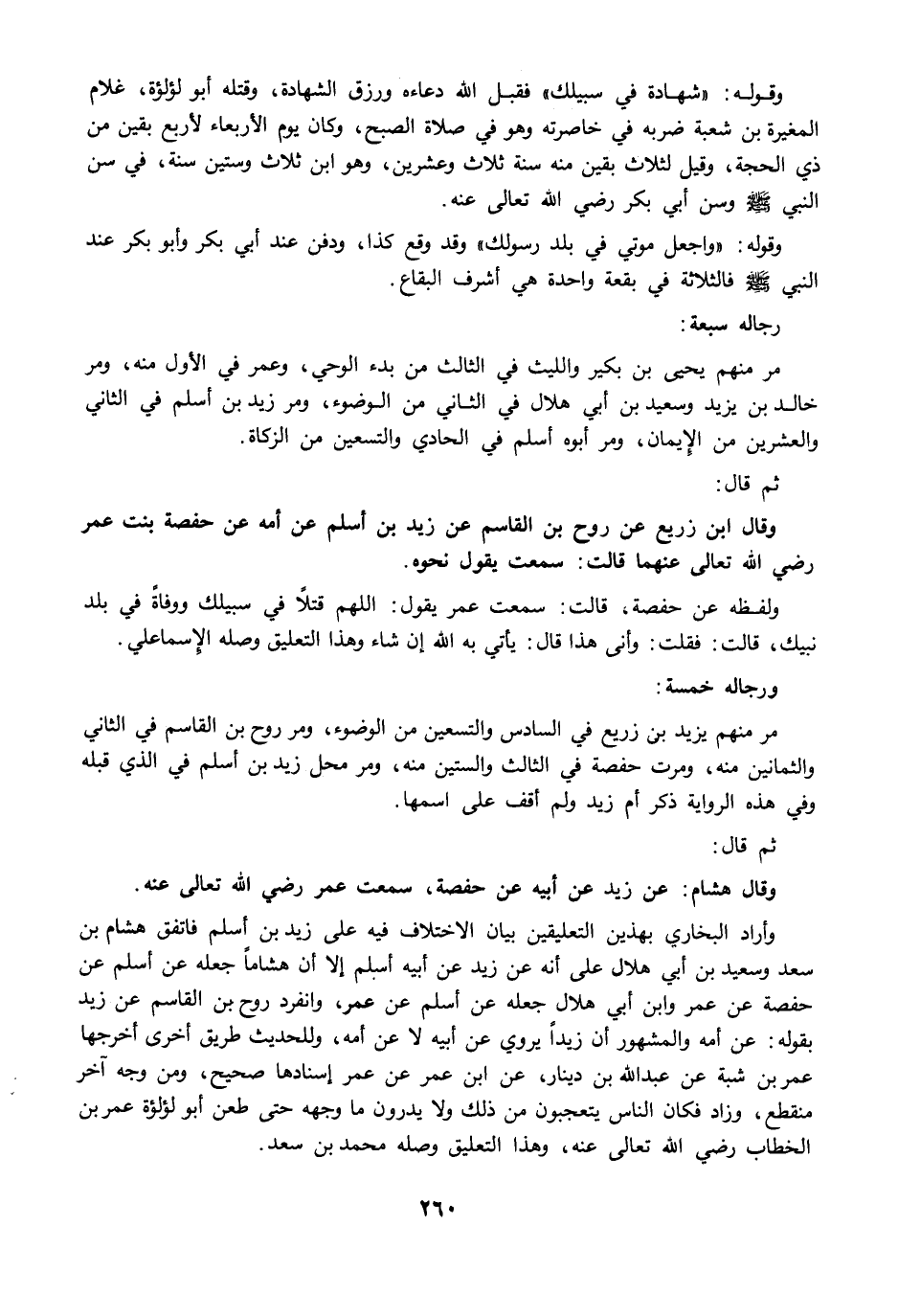 وأراد البخاري بهذين التعليقين بيان الاختلاف فيه على زيد بن أسلم فاتفق هشام بن سعد وسعيد بن أبي هلال على أنه عن زيد عن أبيه أسلم إلا أن هشامًا جعله عن أسلم عن حفصة عن عمر وابن أبي هلال جعله عن أسلم عن عمر، وانفرد روح بن القاسم عن زيد بقوله: عن أمه والمشهور أن زيدًا يروي عن أبيه لا عن أمه، وللحديث طريق أخرى أخرجها عمر بن شبة عن عبد الله بن دينار، عن ابن عمر عن عمر إسنادها صحيح، ومن وجه آخر منقطع، وزاد فكان الناس يتعجبون من ذلك ولا يدرون ما وجهه حتى طعن أبو لؤلؤة عمر بن الخطاب رضي الله تعالى عنه، وهذا التعليق وصله محمد بن سعد.