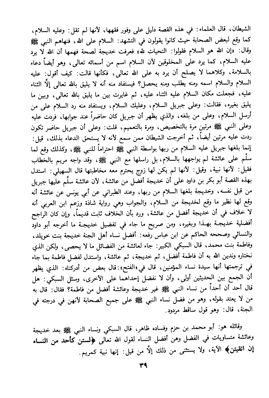 وقائله هو: أبو محمد بن حزم وفساده ظاهر، قال السبكي ونساء النبي -صلى الله عليه وسلم- بعد خديجة وعائشة متساويات في الفضل وهن أفضل النساء لقول الله تعالى {لَسْتُنَّ كَأَحَدٍ مِنَ النِّسَاءِ إِنِ اتَّقَيْتُنَّ} الآية، ولا يستثنى من ذلك إلاَّ من قيل: إنها نبية كمريم.