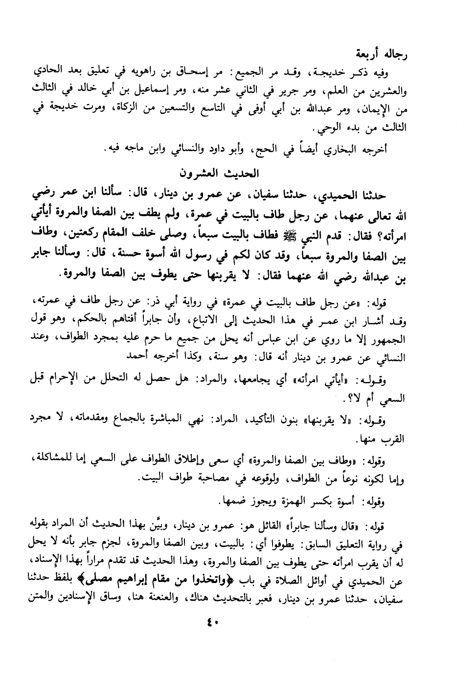 حَدَّثَنَا الْحُمَيْدِيُّ، حَدَّثَنَا سُفْيَانُ، عَنْ عَمْرِو بْنِ دِينَارٍ، قَالَ: سَأَلْنَا ابْنَ عُمَرَ رضي الله عنهما، عَنْ رَجُلٍ طَافَ بِالْبَيْتِ فِي عُمْرَةٍ، وَلَمْ يَطُفْ بَيْنَ الصَّفَا وَالْمَرْوَةِ، أَيَأْتِي امْرَأَتَهُ؟ فَقَالَ: قَدِمَ النَّبِيُّ -صلى الله عليه وسلم- فَطَافَ بِالْبَيْتِ سَبْعًا، وَصَلَّى خَلْفَ الْمَقَامِ رَكْعَتَيْنِ، وَطَافَ بَيْنَ الصَّفَا وَالْمَرْوَةِ سَبْعًا، وَقَدْ كَانَ لَكُمْ فِي رَسُولِ اللَّهِ أُسْوَةٌ حَسَنَةٌ. قَالَ: وَسَأَلْنَا جَابِرَ بْنَ عَبْدِ اللَّهِ رضي الله عنهما فَقَالَ: لاَ يَقْرَبَنَّهَا حَتَّى يَطُوفَ بَيْنَ الصَّفَا وَالْمَرْوَةِ.