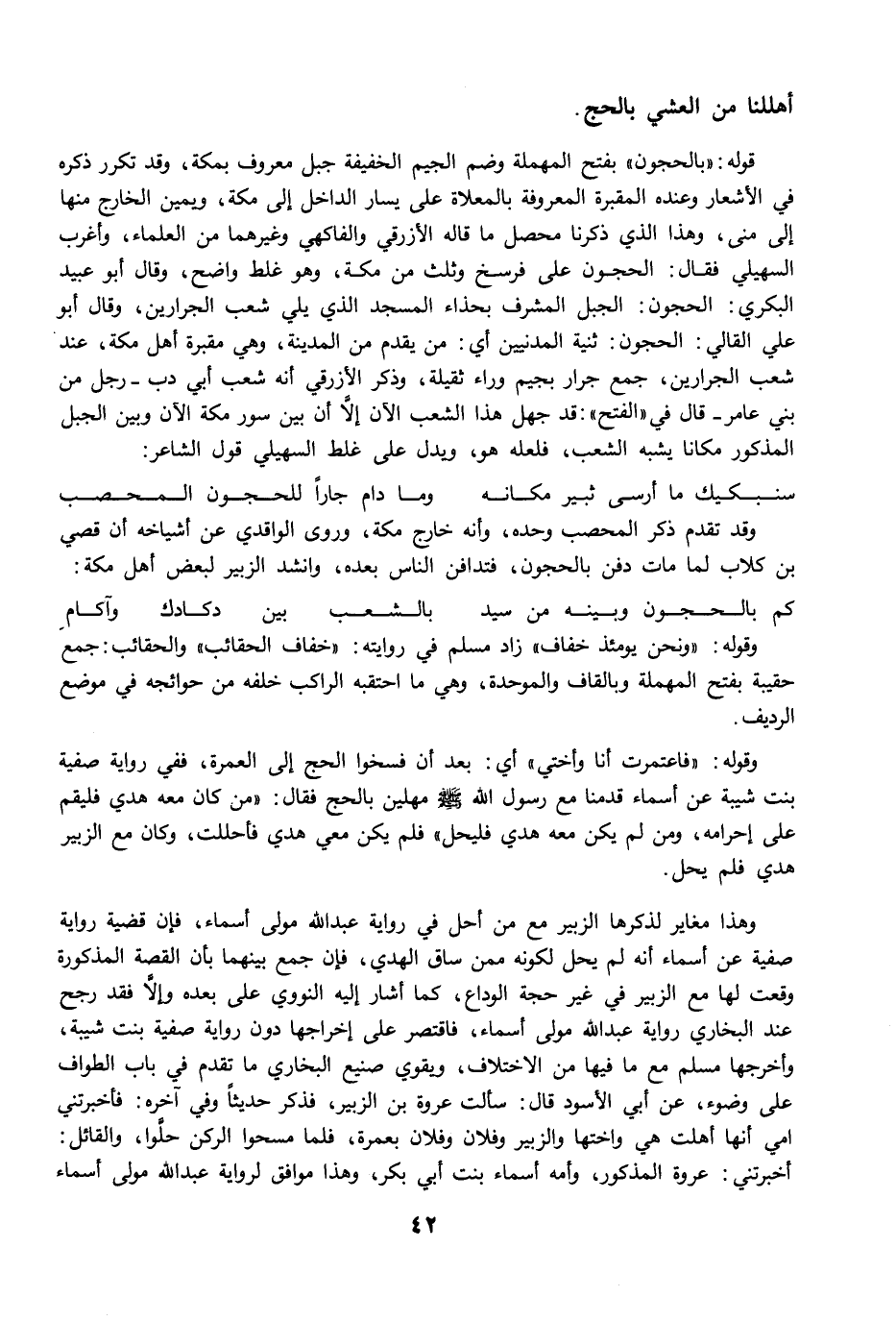 وهذا مغاير لذكرها الزبير مع من أحل في رواية عبد الله مولى أسماء، فإن قضية رواية صفية عن أسماء أنه لم يحل لكونه ممن ساق الهدي، فإن جمع بينهما بأن القصة المذكورة وقعت لها مع الزبير في غير حجة الوداع، كما أشار إليه النووي على بعده وإلاَّ فقد رجح عند البخاري رواية عبد الله مولى أسماء، فاقتصر على إخراجها دون رواية صفية بنت شيبة، وأخرجها مسلم مع ما فيها من الاختلاف، ويقوي صنيع البخاري ما تقدم في باب الطواف على وضوء، عن أبي الأسود قال: سألت عروة بن الزبير، فذكر حديثًا وفي آخره: فأخبرتني أُمي أنها أهلت هي وأختها والزبير وفلان وفلان بعمرة، فلما مسحوا الركن حلَّوا، والقائل: أخبرتني: عروة المذكور، وأمه أسماء بنت أبي بكر، وهذا موافق لرواية عبد الله مولى أسماء