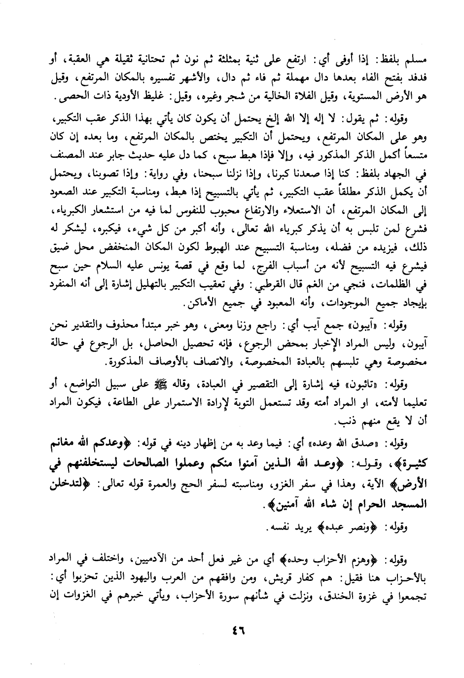 مسلم بلفظ: إذا أوفى أي: ارتفع على ثنية بمثلثة ثم نون ثم تحتانية ثقيلة هي العقبة، أو فدفد بفتح الفاء بعدها قال مهملة ثم فاء ثم قال، والأشهر تفسيره بالمكان المرتفع، وقيل هو الأرض المستوية، وقيل الفلاة الخالية من شجر وغيره، وقيل: غليظ الأودية ذات الحصى.