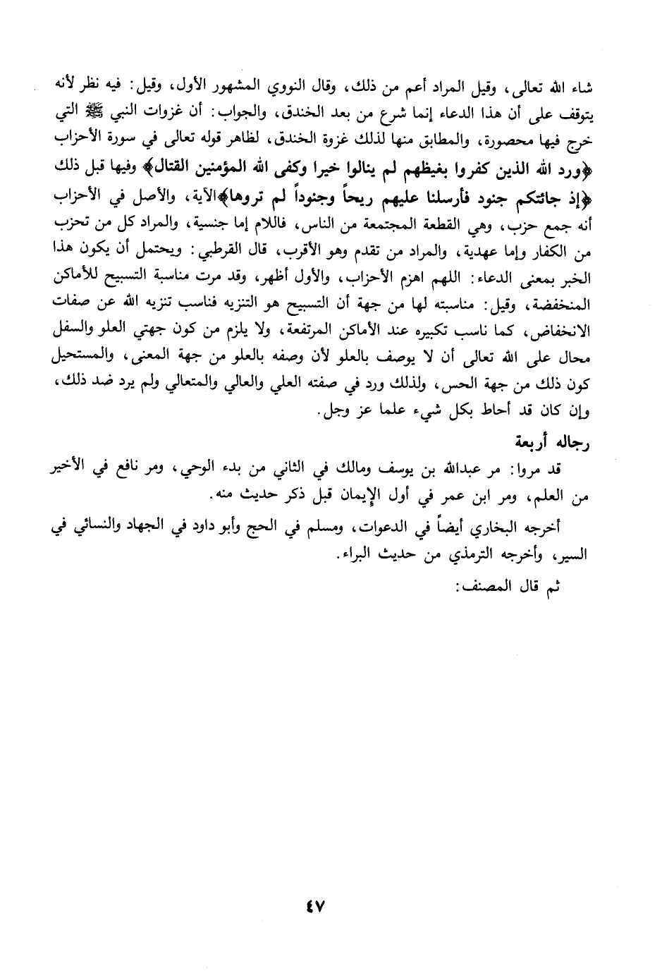 شاء الله تعالى، وقيل المراد أعم من ذلك، وقال النووي المشهور الأول، وقيل: فيه نظر لأنه يتوقف على أن هذا الدعاء إنما شرع من بعد الخندق، والجواب: أن غزوات النبي -صلى الله عليه وسلم- التي خرج فيها محصورة، والمطابق منها لذلك غزوة الخندق، لظاهر قوله تعالى في سورة الأحزاب {وَرَدَّ اللَّهُ الَّذِينَ كَفَرُوا بِغَيْظِهِمْ لَمْ يَنَالُوا خَيْرًا وَكَفَى اللَّهُ الْمُؤْمِنِينَ الْقِتَالَ} وفيها قبل ذلك {إِذْ جَاءَتْكُمْ جُنُودٌ فَأَرْسَلْنَا عَلَيْهِمْ رِيحًا وَجُنُودًا لَمْ تَرَوْهَا} الآية، والأصل في الأحزاب أنه جمع حزب، وهي القطعة المجتمعة من الناس، فاللام إما جنسية، والمراد كل من تحزب من الكفار وإما عهدية، والمراد من تقدم وهو الأقرب، قال القرطبي: ويحتمل أن يكون هذا الخبر بمعنى الدعاء: اللهم اهزم الأحزاب، والأول أظهر، وقد مرت مناسبة التسبيح للأماكن المنخفضة، وقيل: مناسبته لها من جهة أن التسبيح هو التنزيه فناسب تنزيه الله عن صفات الانخفاض، كما ناسب تكبيره عند الأماكن المرتفعة، ولا يلزم من كون جهتي العلو والسفل محال على الله تعالى أن لا يوصف بالعلو لأن وصفه بالعلو من جهة المعنى، والمستحيل كون ذلك من جهة الحس، ولذلك ورد في صفته العلي والعالي والمتعالي ولم يرد ضد ذلك، وإن كان قد أحاط بكل شيء علمًا عَزَّ وَجَلَّ.