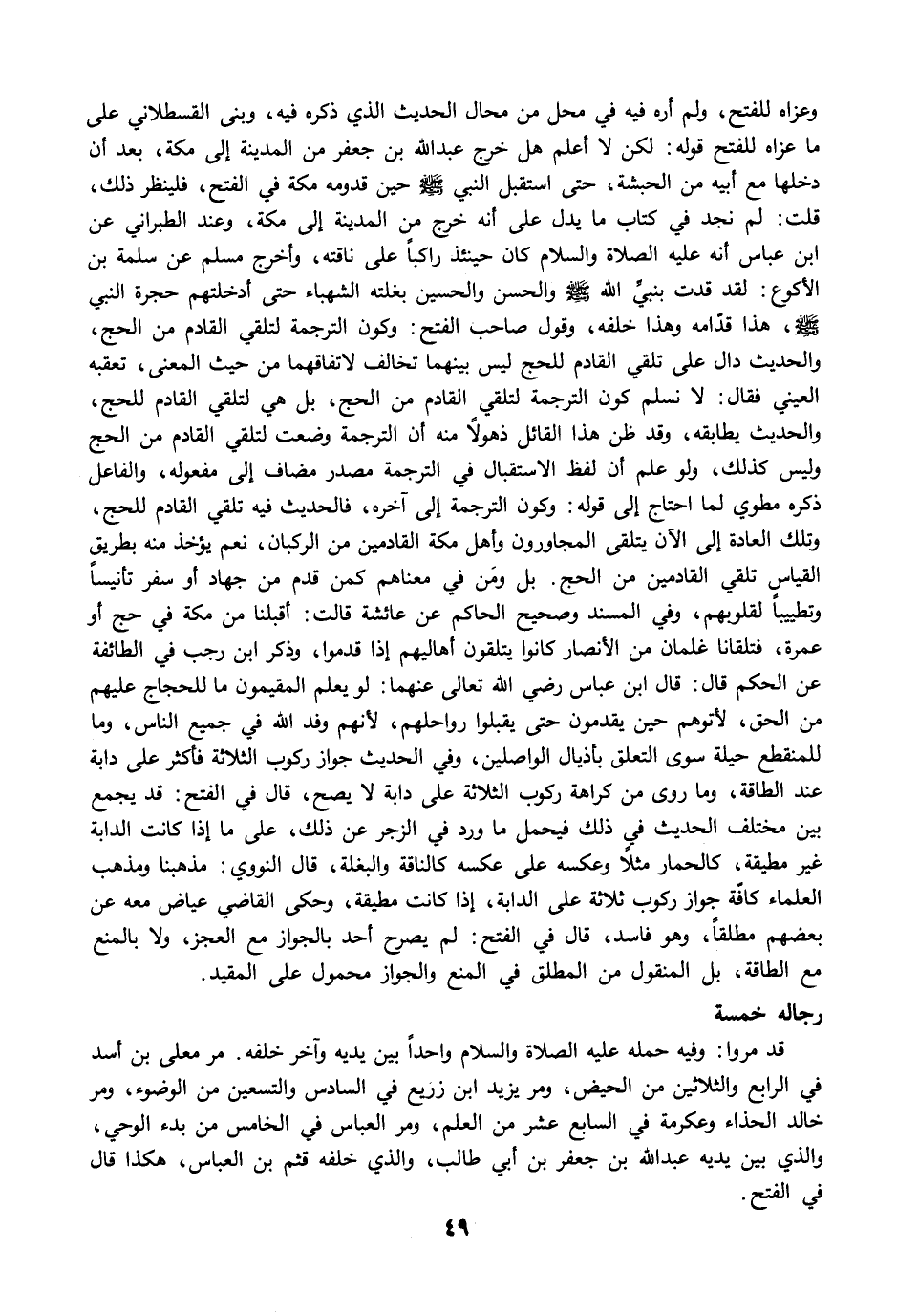 وعزاه للفتح، ولم أره فيه في محل من محال الحديث الذي ذكره فيه، وبنى القسطلاني على ما عزاه للفتح قوله: لكن لا أعلم هل خرج عبد الله بن جعفر من المدينة إلى مكة، بعد أن دخلها مع أبيه من الحبشة، حتى استقبل النبي -صلى الله عليه وسلم- حين قدومه مكة في الفتح، فلينظر ذلك، قلت: لم نجد في كتاب ما يدل على أنه خرج من المدينة إلى مكة، وعند الطبراني عن ابن عباس أنه عليه الصلاة والسلام كان حينئذ راكبًا على ناقته، وأخرج مسلم عن سلمة بن الأكوع: لقد قلت بنبيِّ الله -صلى الله عليه وسلم- والحسن والحسين بغلته الشهباء حتى أدخلتهم حجرة النبي -صلى الله عليه وسلم-، هذا قدّامه وهذا خلفه، وقول صاحب الفتح: وكون الترجمة لتلقي القادم من الحج، والحديث دال على تلقي القادم للحج ليس بينهما تخالف لاتفاقهما من حيث المعنى، تعقبه العيني فقال: لا نسلم كون الترجمة لتلقي القادم من الحج، بل هي لتلقي القادم للحج، والحديث يطابقه، وقد ظن هذا القائل ذهولًا منه أن الترجمة وضعت لتلقي القادم من الحج وليس كذلك، ولو علم أن لفظ الاستقبال في الترجمة مصدر مضاف إلى مفعوله، والفاعل ذكره مطوي لما احتاج إلى قوله: وكون الترجمة إلى آخره، فالحديث فيه تلقي القادم للحج، وتلك العادة إلى الآن يتلقى المجاورون وأهل مكة القادمين من الركبان، نعم يؤخذ منه بطريق القياس تلقي القادمين من الحج. بل ومَن في معناهم كمن قدم من جهاد أو سفر تأنيسًا وتطييبًا لقلوبهم، وفي المسند وصحيح الحاكم عن عائشة قالت: أقبلنا من مكة في حج أو عمرة، فتلقانا غلمان من الأنصار كانوا يتلقون أهاليهم إذا قدموا، وذكر ابن رجب في الطائفة عن الحكم قال: قال ابن عباس رضي الله تعالى عنهما: لو يعلم المقيمون ما للحجاج عليهم من الحق، لأتوهم حين يقدمون حتى يقبلوا رواحلهم؛ لأنهم وفد الله في جميع الناس، وما للمنقطع حيلة سوى التعلق بأذيال الواصلين، وفي الحديث جواز ركوب الثلاثة فأكثر على دابة عند الطاقة، وما روى من كراهة ركوب الثلاثة على دابة لا يصح، قال في الفتح: قد يجمع بين مختلف الحديث في ذلك فيحمل ما ورد في الزجر عن ذلك، على ما إذا كانت الدابة غير مطيقة، كالحمار مثلًا وعكسه على عكسه كالناقة والبغلة، قال النووي: مذهبنا ومذهب العلماء كافّة جواز ركوب ثلاثة على الدابة، إذا كانت مطيقة، وحكى القاضي عياض معه عن بعضهم مطلقًا، وهو فاسد، قال في الفتح: لم يصرح أحد بالجواز مع العجز، ولا بالمنع مع الطاقة، بل المنقول من المطلق في المنع والجواز محمول على المقيد.