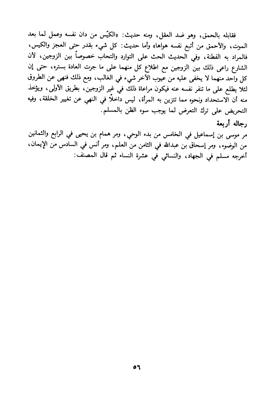 فقابله بالحمق، وهو ضد العقل، ومنه حديث: "الكيّس من دان نفسه وعمل لما بعد الموت، والأحمق من أتبع نفسه هواها" وأما حديث: كل شيء بقدر حتى العجز والكيس، فالمراد به الفطنة، وفي الحديث الحث على التوارد والتحاب خصوصًا بين الزوجين؛ لأن الشارع راعى ذلك بين الزوجين مع اطلاع كل منهما على ما جرت العادة بستره، حتى إن كل واحد منهما لا يخفى عليه من عيوب الآخر شيء في الغالب، ومع ذلك فنهى عن الطروق لئلا يطلع على ما تنفر نفسه عنه فيكون مراعاة ذلك في غير الزوجين، بطريق الأولى، ويؤخذ منه أن الاستحداد ونحوه مما تتزين به المرأة، ليس داخلًا في النهي عن تغيير الخلقة، وفيه التحريض على ترك التعرض لما يوجب سوء الظن بالمسلم.