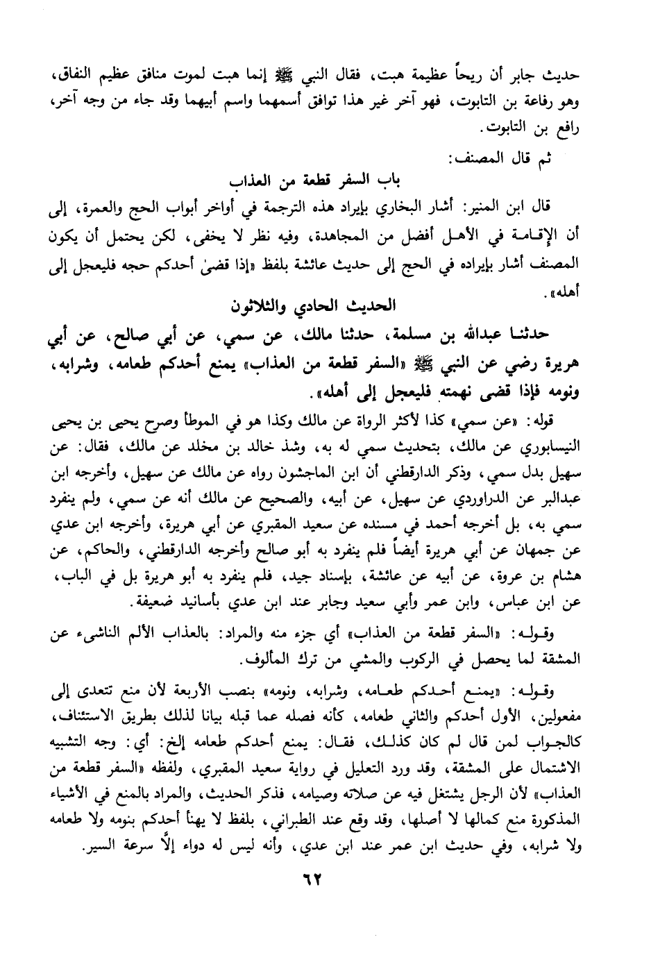 حَدَّثَنَا عَبْدُ اللَّهِ بْنُ مَسْلَمَةَ، حَدَّثَنَا مَالِكٌ، عَنْ سُمَيٍّ، عَنْ أَبِي صَالِحٍ، عَنْ أَبِي هُرَيْرَةَ رضي الله عنه عَنِ النَّبِيِّ -صلى الله عليه وسلم- قَالَ: "السَّفَرُ قِطْعَةٌ مِنَ الْعَذَابِ، يَمْنَعُ أَحَدَكُمْ طَعَامَهُ، وَشَرَابَهُ، وَنَوْمَهُ، فَإِذَا قَضَى نَهْمَتَهُ فَلْيُعَجِّلْ إِلَى أَهْلِهِ".