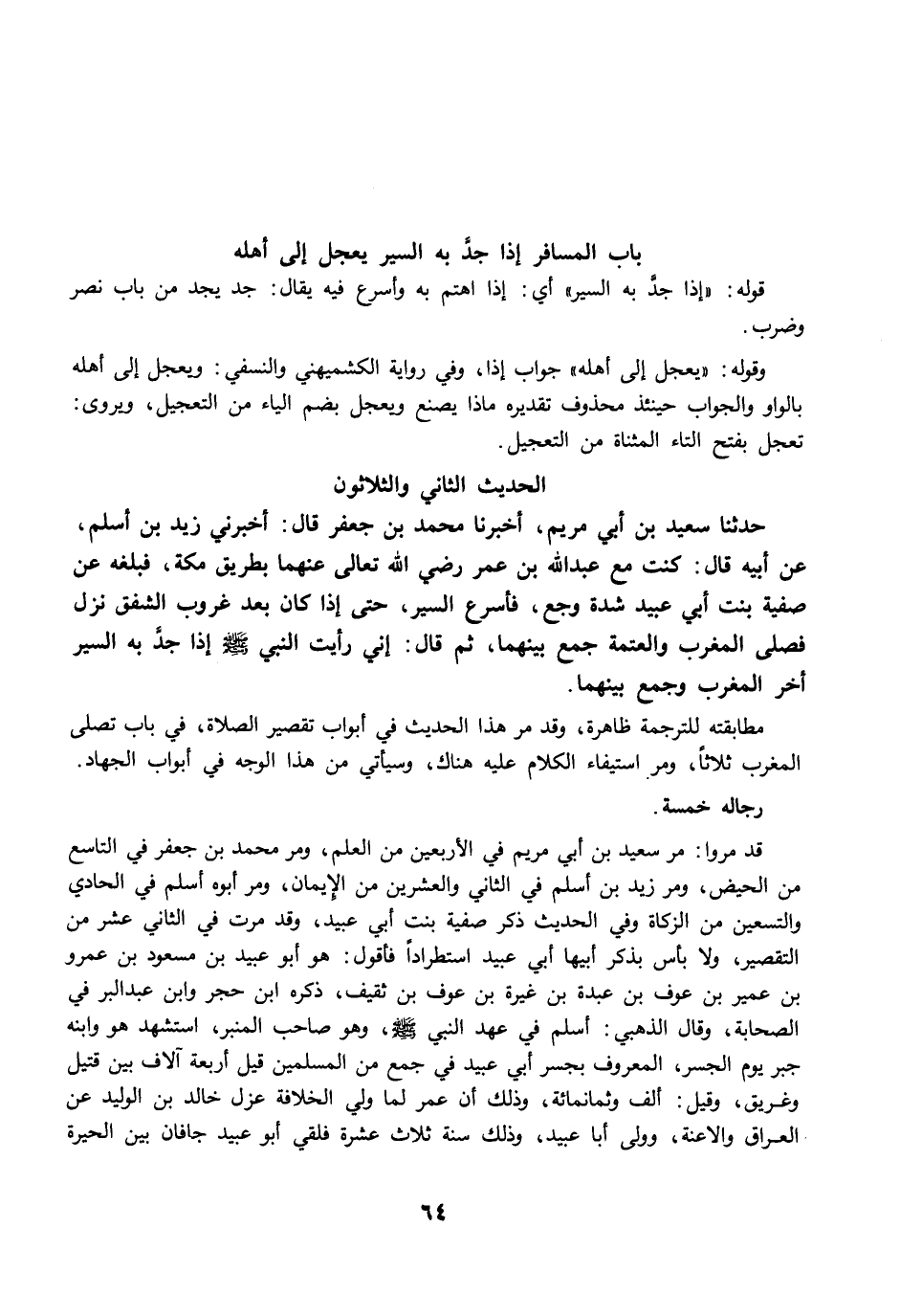 قد مرّوا: مرَّ سعيد بن أبي مريم في الأربعين من العلم، ومرَّ محمد بن جعفر في التاسع من الحيض، ومرَّ زيد بن أسلم في الثاني والعشرين من الإيمان، ومرَّ أبوه أسلم في الحادي والتسعين من الزكاة وفي الحديث ذكر صفية بنت أبي عبيد، وقد مرت في الثاني عشر من التقصير، ولا بأس بذكر أبيها أبي عبيد استطرادًا فأقول: هو أبو عبيد بن مسعود بن عمرو بن عمير بن عوف بن عبدة بن غيرة بن عوف بن ثقيف، ذكره ابن حجر وابن عبد البر في الصحابة، وقال الذهبي: أسلم في عهد النبي -صلى الله عليه وسلم-، وهو صاحب المنبر، استشهد هو وابنه جبر يوم الجسر، المعروف بجسر أبي عبيد في جمع من المسلمين قيل أربعة آلاف بين قتيل وغريق، وقيل: ألف وثمانمائة، وذلك أن عمر لما ولي الخلافة عزل خالد بن الوليد عن العراق والاعنة، وولى أبا عبيد، وذلك سنة ثلاث عشرة فلقي أبو عبيد جافان بين الحيرة