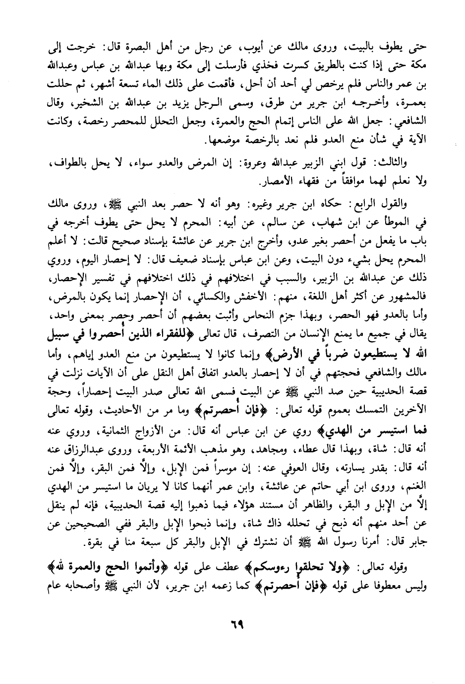 حتى يطوف بالبيت، وروى مالك عن أيوب، عن رجل من أهل البصرة قال: خرجت إلى مكة حتى إذا كنت بالطريق كسرت فخذي فأرسلت إلى مكة وبها عبد الله بن عباس وعبد الله بن عمر والناس فلم يرخص لي أحد أن أحل، فأقمت على ذلك الماء تسعة أشهر، ثم حللت بعمرة، وأخرجه ابن جرير من طرق، وسمى الرجل يزيد بن عبد الله بن الشخير، وقال الشافعي: جعل الله على الناس إتمام الحج والعمرة، وجعل التحلل للمحصر رخصة، وكانت الآية في شأن منع العدو فلم نعد بالرخصة موضعها.