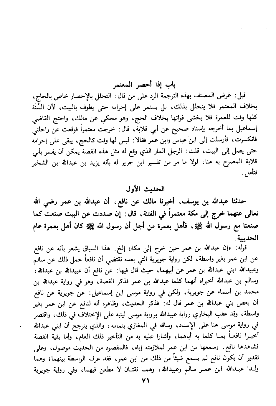 قوله: "إن عبد الله بن عمر حين خرج إلى مكة" الخ. هذا السياق يشعر بأنه عن نافع عن ابن عمر بغير واسطة، لكن رواية جويرية التي بعده تقتضي أن نافعًا حمل ذلك عن سالم وعبيد الله ابني عبد الله بن عمر عن أبيهما، حيث قال فيها: عن نافع أن عبيد الله بن عبد الله، وسالم بن عبد الله أخبراه أنهما كلما عبد الله بن عمر فذكر القصة، وهو في رواية عبد الله بن محمد بن أسماء عن جويرية، ولكن في رواية موسى ابن إسماعيل: عن جويرية عن نافع أن بعض بني عبد الله بن عمر قال له: فذكر الحديث، وظاهره أنه لنافع عن ابن عمر بغير واسطة، وقد عقب البخاري رواية عبيد الله برواية موسى لينبه على الإختلاف في ذلك، واقتصر في رواية موسى هنا على الإسناد، وساقه في المغازي بتمامه، والذي يترجح أن ابني عبد الله أخبرا نافعًا بما كلما به أباهما، وأشارا عليه به من التأخير ذلك العام، وأما بقية القصة فشاهدها نافع، وسمعها من ابن عمر لملازمته إياه، فالمقصود من الحديث موصول، وعلى تقدير أن يكون نافع لم يسمع شيئًا من ذلك من ابن عمر، فقد عرف الواسطة بينهما؛ وهما ولدا عبد الله ابن عمر سالم وعبيد الله، وهما ثقتان لا مطعن فيهما، وفي رواية جويرية