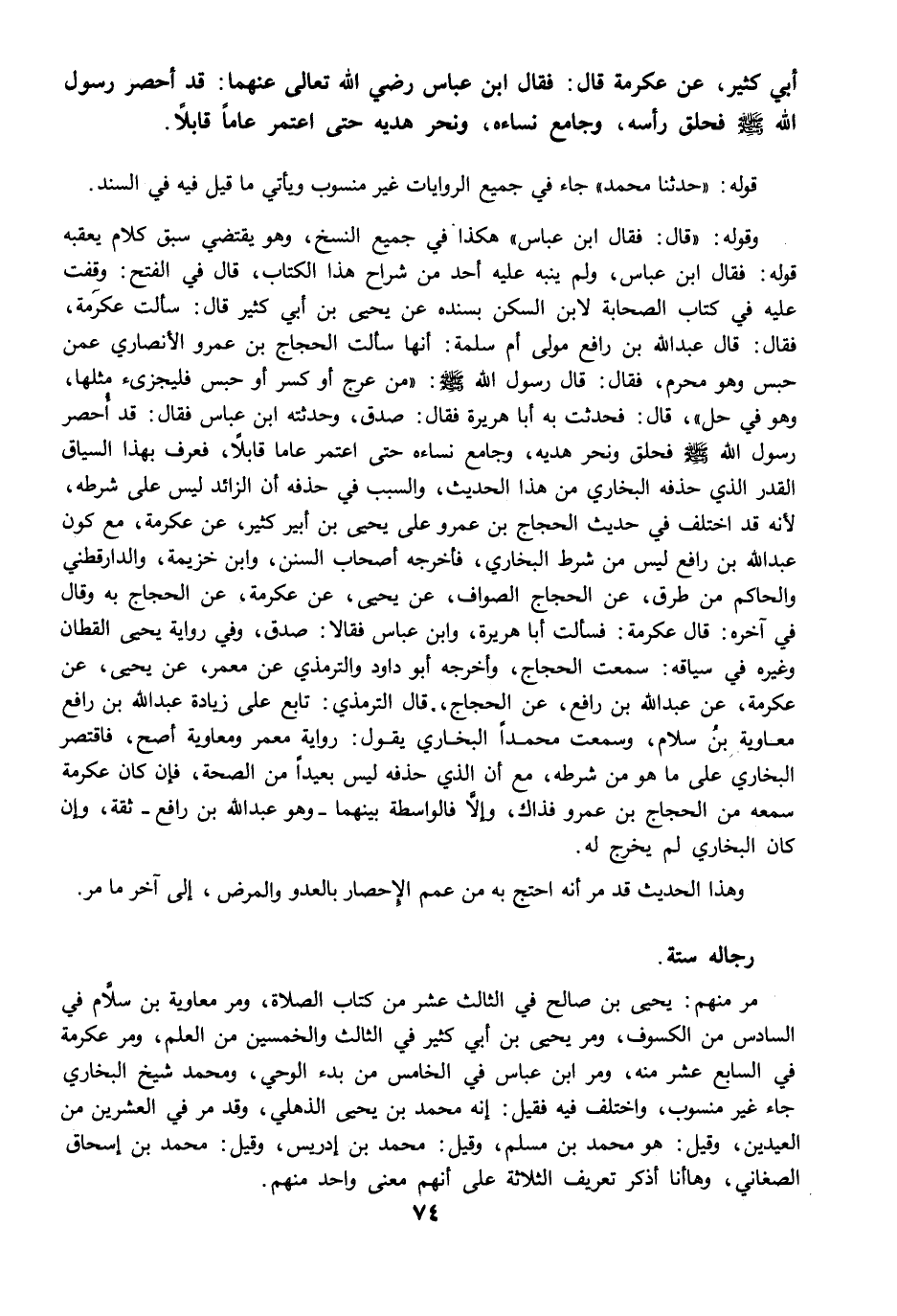 أَبِي كَثِيرٍ، عَنْ عِكْرِمَةَ قَالَ: فَقَالَ ابْنُ عَبَّاسٍ رضي الله عنهما: قَدْ أُحْصِرَ رَسُولُ اللَّهِ -صلى الله عليه وسلم- فَحَلَقَ رَأْسَهُ وَجَامَعَ نِسَاءَهُ، وَنَحَرَ هَدْيَهُ، حَتَّى اعْتَمَرَ عَامًا قَابِلاً.