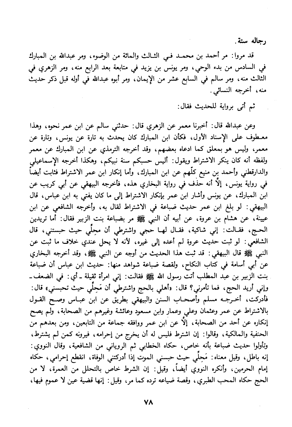 وعن عبد الله قال: أخبرنا معمر عن الزهري قال: حدثني سالم عن ابن عمر نحوه، وهذا معطوف على الإسناد الأول، فكان ابن المبارك كان يحدث به تارة عن يونس، وتارة عن معمر، وليس هو بمعلق كما ادعاه بعضهم، وقد أخرجه الترمذي عن ابن المبارك عن معمر ولفظه أنه كان ينكر الاشتراط ويقول: أليس حسبكم سنة نبيكم، وهكذا أخرجه الإسماعيلي والدارقطني وأحمد بن منيع كلّهم عن ابن المبارك، وأما إنكار ابن عمر الاشتراط فثابت أيضًا في رواية يونس، إلاَّ أنه حذف في رواية البخاري هذه، فأخرجه البيهقي عن أبي كريب عن ابن المبارك، عن يونس وأشار ابن عمر بإنكار الاشتراط إِلى ما كان يفتي به ابن عباس، قال البيهقي: لو بلغ ابن عمر حديث ضباعة في الاشتراط لقال به، وأخرجه الشافعي عن ابن عيينة، عن هشام بن عروة، عن أبيه أن النبي -صلى الله عليه وسلم- مرَّ بضباعة بنت الزبير فقال: أما تريدين الحج، فقالت: إني شاكية، فقال لها حجي واشترطي أن مَحِلِّي حيث حبستني، قال الشافعي: لو ثبت حديث عروة لم أعده إِلى غيره؛ لأنه لا يحل عندي خلاف ما ثبت عن النبي -صلى الله عليه وسلم- قال البيهقي: قد ثبت هذا الحديث من أوجه عن النبي -صلى الله عليه وسلم-، وقد أخرجه البخاري عن أبي أسامة في كتاب النكاح، ولقصة ضباعة شواهد منها: حديث ابن عباس أن ضباعة بنت الزبير بن عبد المطلب أتت رسول الله -صلى الله عليه وسلم- فقالت: إِني امرأة ثقيلة -أي: في الضعف- وإني أريد الحج، فما تأمرني؟ قال: "أهلي بالحج واشترطي أن مَحِلِّي حيث تحبسني" قال: فأدركت، أخرجه مسلم وأصحاب السنن والبيهقي بطريق عن ابن عباس وصح القول بالاشتراط عن عمر وعثمان وعلي وعمار وابن مسعود وعائشة وغيرهم من الصحابة، ولم يصح إنكاره عن أحد من الصحابة، إلاَّ عن ابن عمر ووافقه جماعة من التابعين، ومن بعدهم من الحنفية والمالكية، وقالوا: إِن اشترط فليس له أن يخرج من إحرامه، فيرونه كمن لم يشترط، وتأولوا حديث ضباعة بأنه خاص، حكاه الخطابي ثم الروياني من الشافعية، وقال النووي: إنه باطل، وقيل معناه: مَحِلِّي حيث حبسني الموت إذا أدركتني الوفاة، انقطع إِحرامي، حكاه إمام الحرمين، وأنكره النووي أيضًا، وقيل: إن الشرط خاص بالتحلل من العمرة، لا من الحج حكاه المحب الطبري، وقصة ضياعه ترده كما مرَّ، وقيل: إنها قضية عين لا عموم فيها،