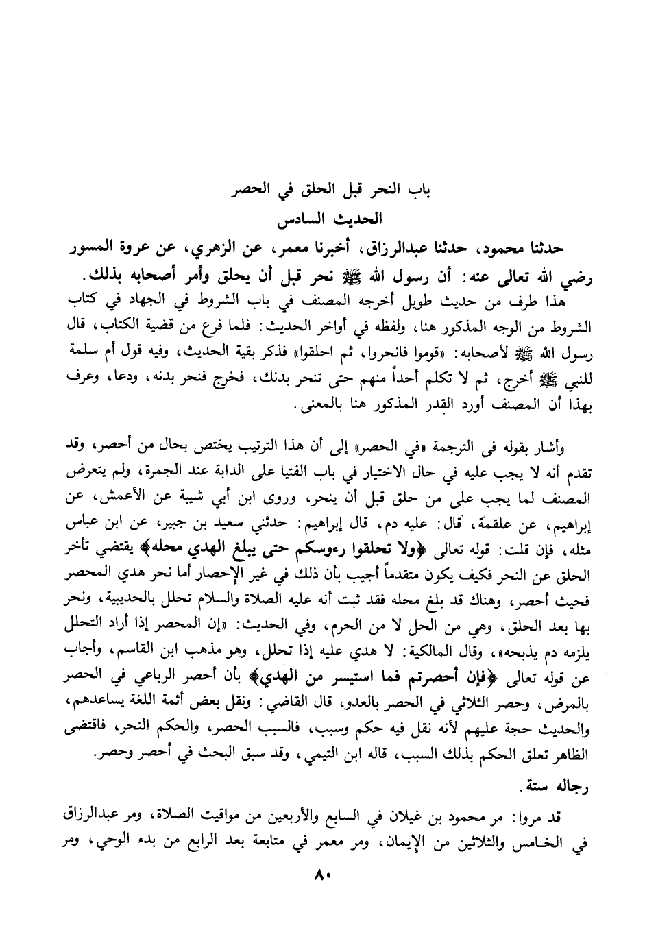 حَدَّثَنَا مَحْمُودٌ، حَدَّثَنَا عَبْدُ الرَّزَّاقِ، أَخْبَرَنَا مَعْمَرٌ، عَنِ الزُّهْرِيِّ، عَنْ عُرْوَةَ عَنِ الْمِسْوَرِ رضي الله عنه: أَنَّ رَسُولَ اللَّهِ -صلى الله عليه وسلم- نَحَرَ قَبْلَ أَنْ يَحْلِقَ، وَأَمَرَ أَصْحَابَهُ بِذَلِكَ.