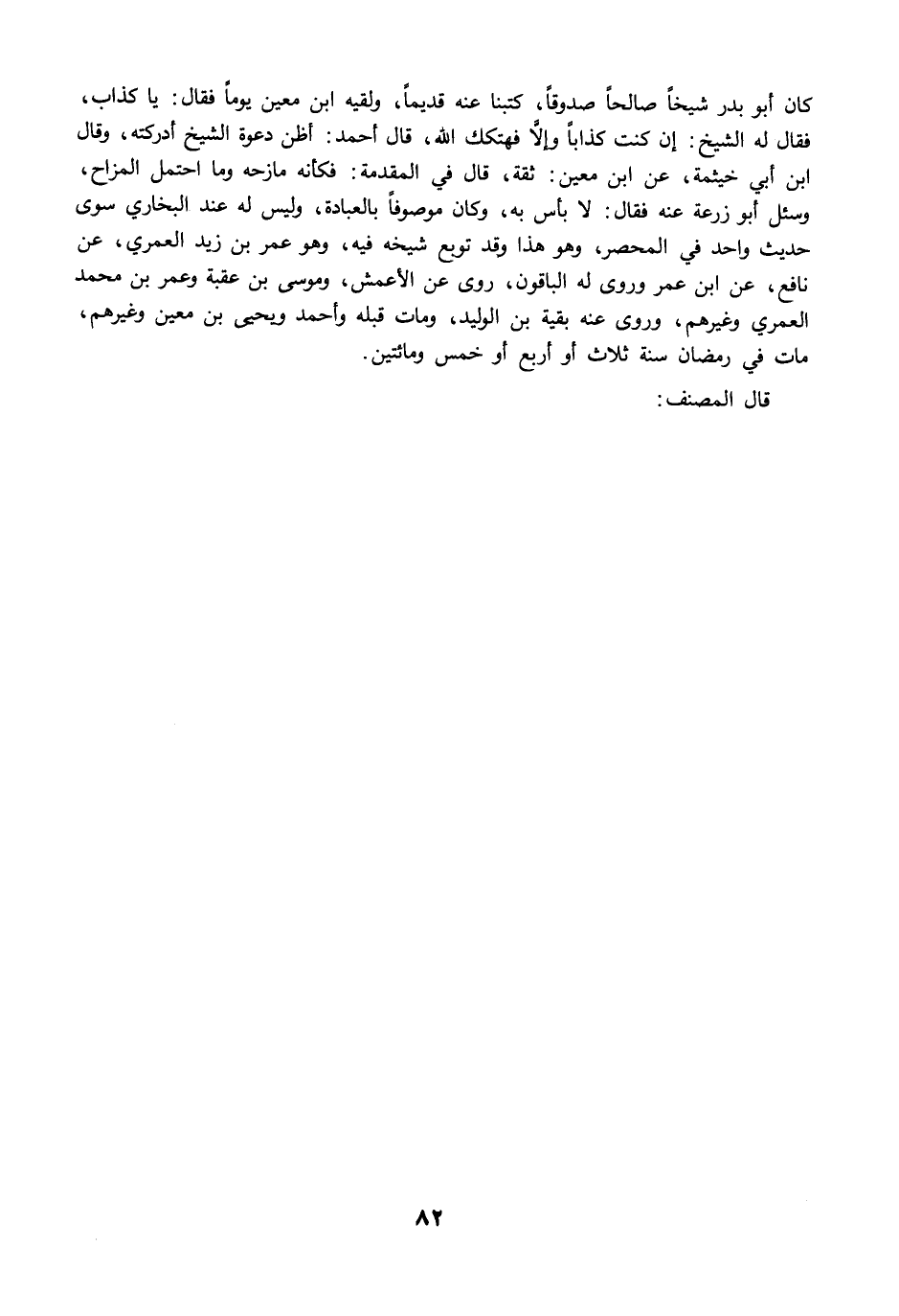 كان أبو بدر شيخًا صالحًا صدوقًا، كتبنا عنه قديمًا، ولقيه ابن معين يومًا فقال: يا كذاب، فقال له الشيخ: إن كنت كذابًا وإلاَّ فهتكك الله، قال أحمد: أظن دعوة الشيخ أدركته، وقال ابن أبي خيثمة، عن ابن معين: ثقة، قال في المقدمة: فكأنه مازحه وما احتمل المزاح، وسئل أبو زرعة عنه فقال: لا بأس به، وكان موصوفًا بالعبادة، وليس له عند البخاري سوى حديث واحد في المحصر، وهو هذا وقد توبع شيخه فيه، وهو عمر بن زيد العمري، عن نافع، عن ابن عمر وروى له الباقون، روى عن الأعمش، وموسى بن عقبة وعمر بن محمد العمري وغيرهم، وروى عنه بقية بن الوليد، ومات قبله وأحمد ويحيى بن معين وغيرهم، مات في رمضان سنة ثلاث أو أربع أو خمس ومائتين.