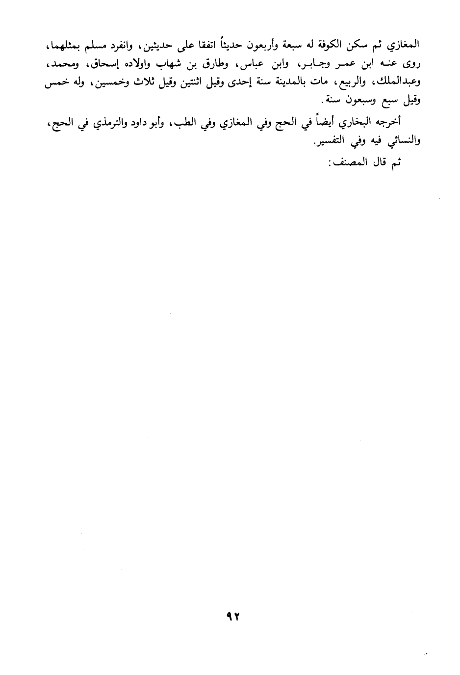 المغازي ثم سكن الكوفة له سبعة وأربعون حديثًا اتفقا على حديثين، وانفرد مسلم بمثلهما، روى عنه ابن عمر وجابر، وابن عباس، وطارق بن شهاب وأولاده إسحاق، ومحمد، وعبد الملك، والربيع، مات بالمدينة سنة إحدى وقيل اثنتين وقيل ثلاث وخمسين، وله خمس وقيل سبع وسبعون سنة.
