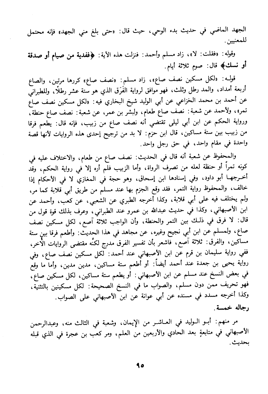 والمحفوظ عن شعبة أنه قال في الحديث: نصف صاع من طعام، والاختلاف عليه في كونه تمرًا أو حنظة لعله من تصرف الرواة، وأما الزبيب فلم أره إلا في رواية الحكم، وقد أخرجها أبو داود، وفي إسنادها ابن إسحاق، وهو حجة في المغازي لا في الأحكام إذا خالف، والمحفوظ رواية التمر، فقد وقع الجزم بها عند مسلم من طريق أبي قلابة كما مرَّ، ولم يختلف فيه على أبي قلابة، وكذا أخرجه الطبري عن الشعبي، عن كعب، وأحمد عن ابن الأصبهاني، وكذا في حديث عبد الله بن عمرو عند الطبراني، وعرف بذلك قوة قول من قال: لا فرق في ذلك بين التمر والحنطة، وأن الواجب ثلاثة آصع، لكل مسكين نصف صاع، ولمسلم عن ابن أبي نجيح وغيره، عن مجاهد في هذا الحديث: وأطعم فرقا بين ستة مساكين، والفرق: ثلاثة آصع، فاشعر بأن تفسير الفرق مدرج لكنَّه مقتضى الروايات الأُخر، ففي رواية سليمان بن قرم عن ابن الأصبهاني عند أحمد: لكل مسكين نصف صاع، وفي رواية يحيى بن جعدة عند أحمد أيضًا: أو أطعم ستة مساكين، مدين مدين، وأما ما وقع في بعض النسخ عند مسلم عن ابن الأصبهاني: أو يطعم ستة مساكين، لكل مسكين صاع، فهو تحريف ممن دون مسلم، والصواب ما في النسخ الصحيحة: لكل مسكينين بالتثنية، وكذا أخرجه مسدد في مسنده عن أبي عوانة عن ابن الأصبهاني على الصواب.