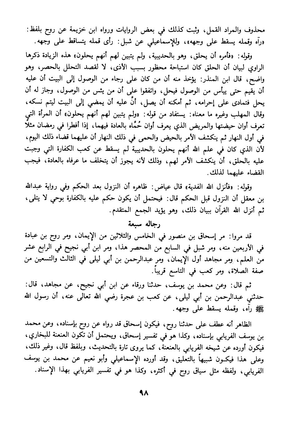 قد مرّوا: مرَّ إسحاق بن منصور في الخامس والثلاثين من الإيمان، ومرَّ روح بن عبادة في الأربعين منه، ومرَّ شبل في السابع من المحصر هذا، ومرَّ ابن أبي نجيح في الرابع عشر من العلم، ومرَّ مجاهد أول الإيمان، ومرَّ عبد الرحمن بن أبي ليلى في الثالث والتسعين من صفة الصلاة، ومرَّ كعب في التاسع قريبًا.