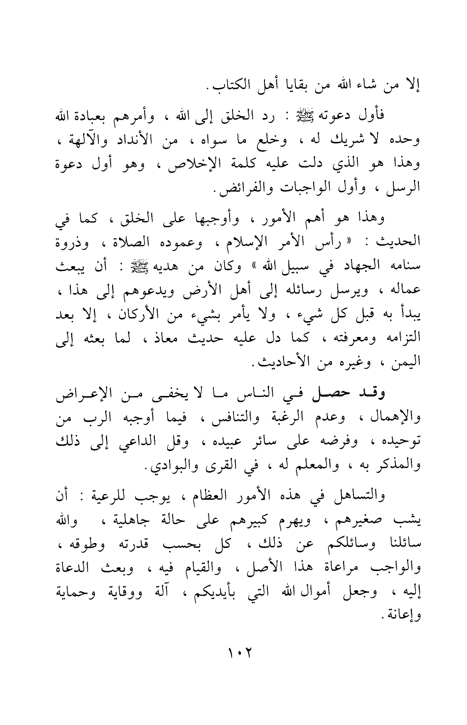 والتساهل في هذه الأمور العظام يوجب للرعية أن يشب صغيرهم ويهرم كبيرهم على حالة جاهلية؛ والله سائلنا وسائلكم عن ذلك، كل بحسب قدرته وطوقه، والواجب مراعاة هذا الأصل، والقيام فيه، وبعث الدعاة إليه، وجعل أموال الله التي بأيديكم، آلة ووقاية وحماية وإعانة.