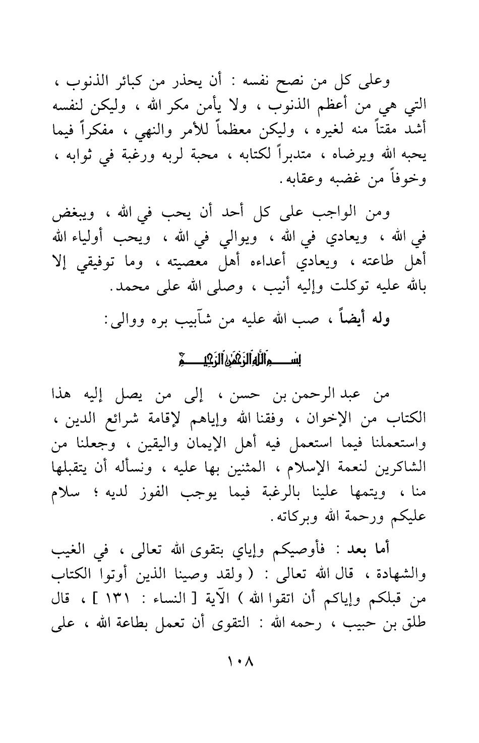 من عبد الرحمن بن حسن، إلى من يصل إليه هذا الكتاب من الإخوان، وفقنا الله وإياهم لإقامة شرائع الدين، واستعملنا فيما استعمل فيه أهل الإيمان واليقين، وجعلنا من الشاكرين لنعمة الإسلام، المثنين بها عليه، ونسأله أن يتقبلها منا، ويتمها علينا بالرغبة فيما يوجب الفوز لديه; سلام عليكم ورحمة الله وبركاته.