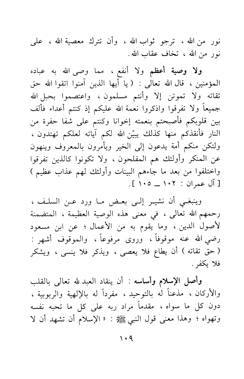 ولا وصية أعظم ولا أنفع، مما وصى الله به عباده المؤمنين، قال الله تعالى: {يَا أَيُّهَا الَّذِينَ آمَنُوا اتَّقُوا اللَّهَ حَقَّ تُقَاتِهِ وَلا تَمُوتُنَّ إِلاّ وَأَنْتُمْ مُسْلِمُونَ وَاعْتَصِمُوا بِحَبْلِ اللَّهِ جَمِيعاً وَلا تَفَرَّقُوا وَاذْكُرُوا نِعْمَتَ اللَّهِ عَلَيْكُمْ إِذْ كُنْتُمْ أَعْدَاءً فَأَلَّفَ بَيْنَ قُلُوبِكُمْ فَأَصْبَحْتُمْ بِنِعْمَتِهِ إِخْوَاناً وَكُنْتُمْ عَلَى شَفَا حُفْرَةٍ مِنَ النَّارِ فَأَنْقَذَكُمْ مِنْهَا كَذَلِكَ يُبَيِّنُ اللَّهُ لَكُمْ آيَاتِهِ لَعَلَّكُمْ تَهْتَدُونَ وَلْتَكُنْ مِنْكُمْ أُمَّةٌ يَدْعُونَ إِلَى الْخَيْرِ وَيَأْمُرُونَ بِالْمَعْرُوفِ وَيَنْهَوْنَ عَنِ الْمُنْكَرِ وَأُولَئِكَ هُمُ الْمُفْلِحُونَ وَلا تَكُونُوا كَالَّذِينَ تَفَرَّقُوا وَاخْتَلَفُوا مِنْ بَعْدِ مَا جَاءَهُمُ الْبَيِّنَاتُ وَأُولَئِكَ لَهُمْ عَذَابٌ عَظِيمٌ} [سورة آل عمران آية: 102-105] .