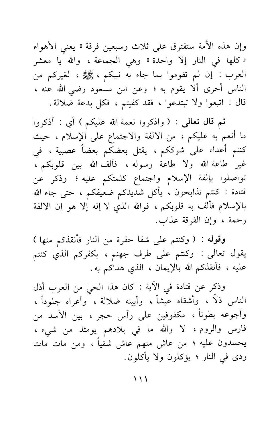 ثم قال تعالى {وَاذْكُرُوا نِعْمَتَ اللَّهِ عَلَيْكُمْ} [سورة آل عمران آية: 103] أي: أذكروا ما أنعم به عليكم، من الألفة والاجتماع على الإسلام، حيث كنتم أعداء على شرككم، يقتل بعضكم بعضا عصبية، في غير طاعة الله ولا طاعة رسوله، فألف الله بين قلوبكم، تواصلوا بألفة الإسلام واجتماع كلمتكم عليه; وذكر عن قتادة: كنتم تذابحون، يأكل شديدكم ضعيفكم، حتى جاء الله بالإسلام فألف به قلوبكم، فوالله الذي لا إله إلا هو إن الألفة رحمة، وإن الفرقة عذاب.