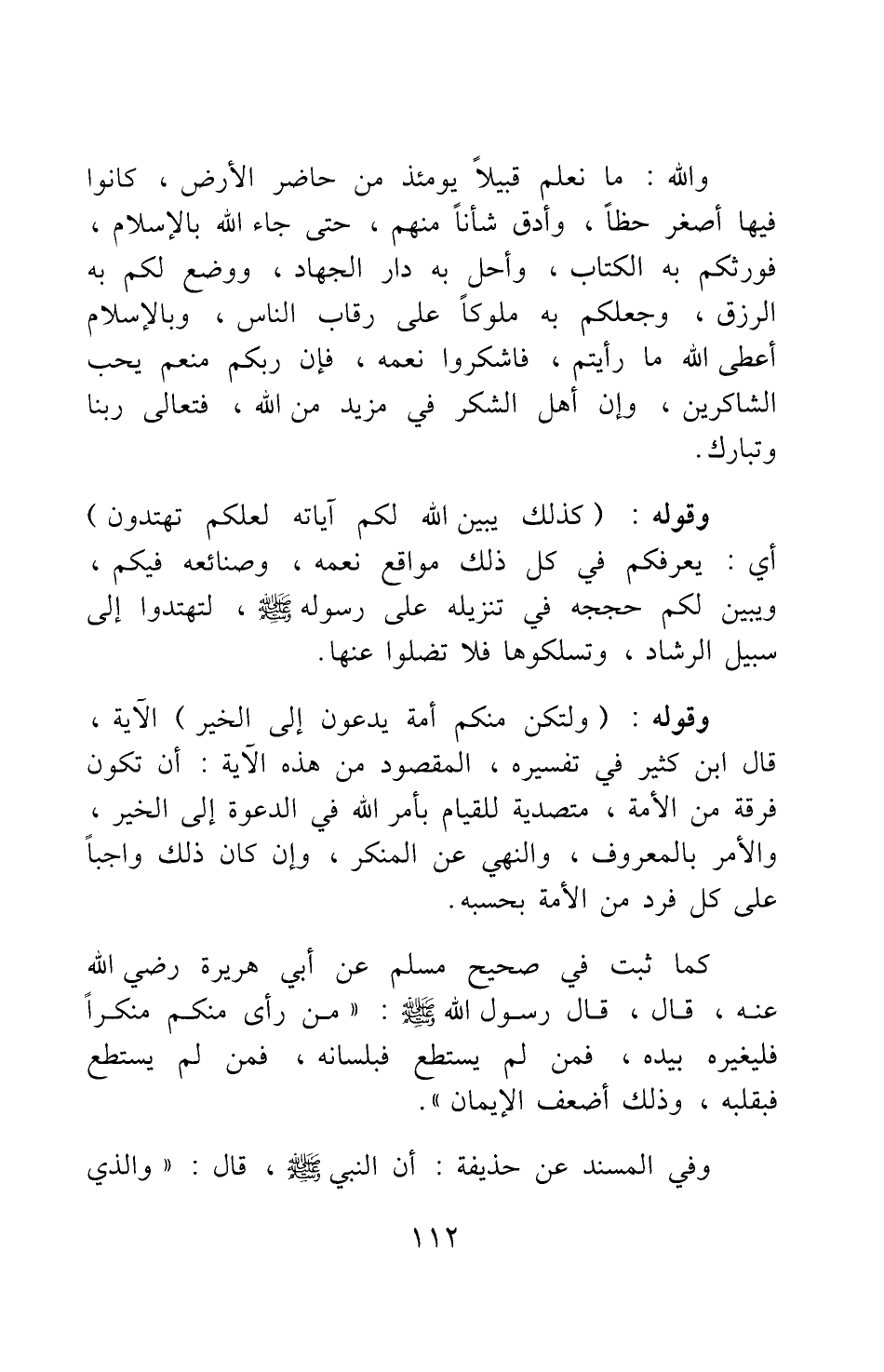 والله: ما نعلم قبيلا يومئذ من حاضر الأرض كانوا فيها أصغر حظا، وأدق شأنا منهم، حتى جاء الله بالإسلام، فورثكم به الكتاب، وأحل به دار الجهاد، ووضع لكم به الرزق، وجعلكم به ملوكا على رقاب الناس، وبالإسلام أعطى الله ما رأيتم؛ فاشكروا نعمه، فإن ربكم منعم يحب الشاكرين، وإن أهل الشكر في مزيد من الله، فتعالى ربنا وتبارك.