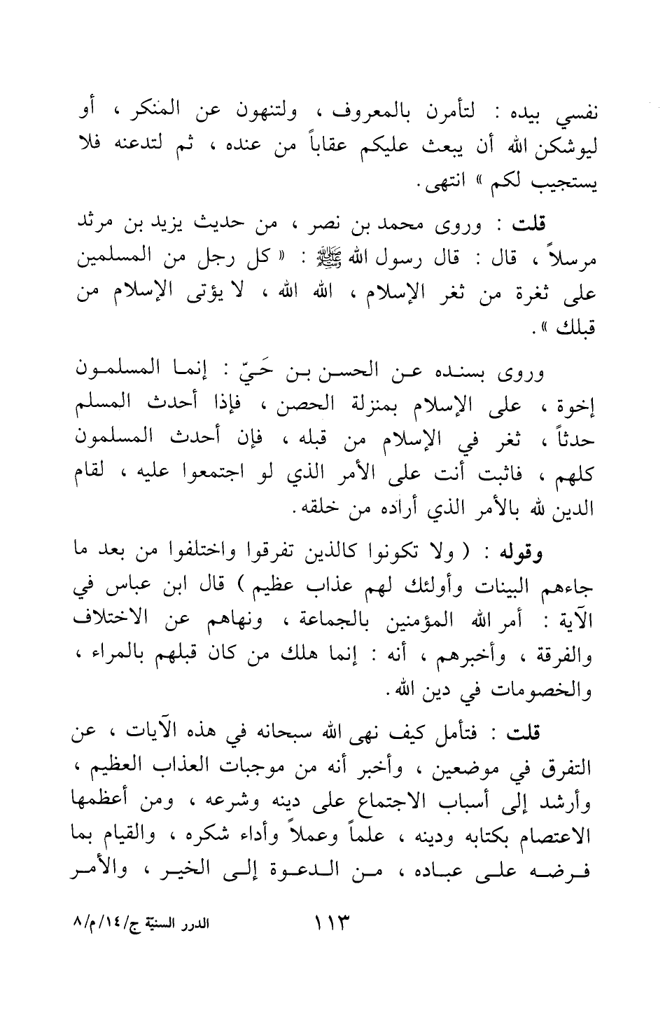 قلت: فتأمل كيف نهى الله سبحانه في هذه الآيات عن التفرق في موضعين، وأخبر أنه من موجبات العذاب العظيم؛ وأرشد إلى أسباب الاجتماع على دينه وشرعه، ومن أعظمها: الاعتصام بكتابه ودينه، علما وعملا، وأداء شكره، والقيام بما فرضه على عباده من الدعوة إلى الخير، والأمر