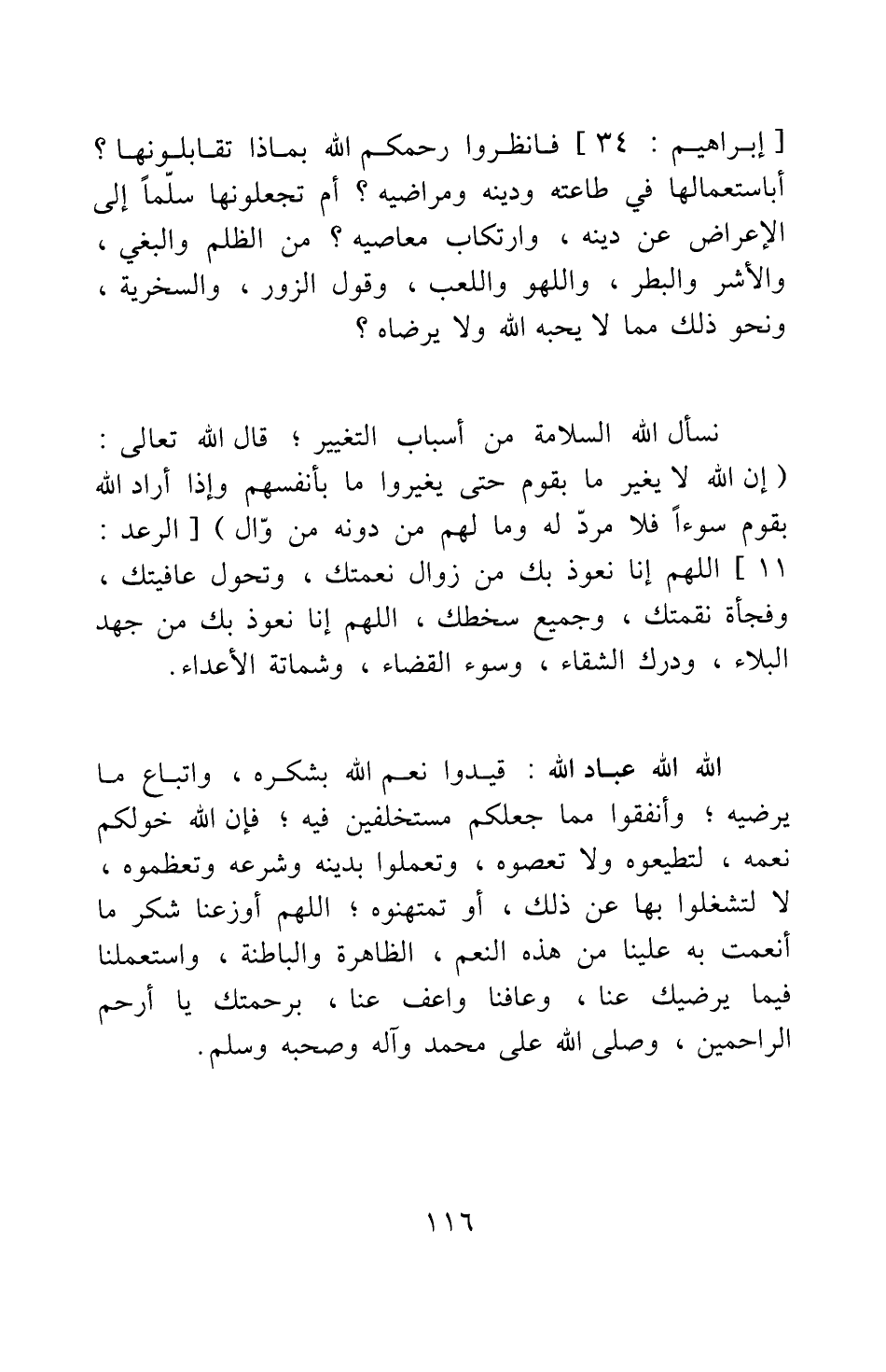 نسأل الله السلامة من أسباب التغيير; قال الله تعالى: {إِنَّ اللَّهَ لا يُغَيِّرُ مَا بِقَوْمٍ حَتَّى يُغَيِّرُوا مَا بِأَنْفُسِهِمْ وَإِذَا أَرَادَ اللَّهُ بِقَوْمٍ سُوءاً فَلا مَرَدَّ لَهُ وَمَا لَهُمْ مِنْ دُونِهِ مِنْ وَالٍ} [سورة الرعد آية: 11] . اللهم إنا نعوذ بك من زوال نعمتك، وتحول عافيتك، وفجأة نقمتك، وجميع سخطك. اللهم إنا نعوذ بك من جهد البلاء، ودرك الشقاء، وسوء القضاء، وشماتة الأعداء.