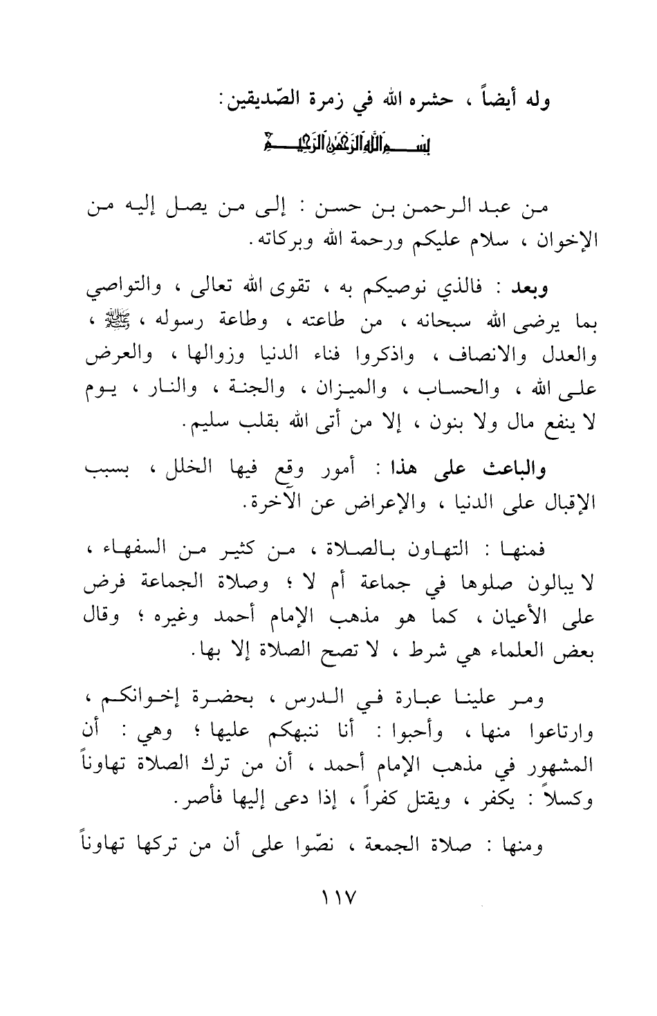 من عبد الرحمن بن حسن: إلى من يصل إليه من الإخوان، سلام عليكم ورحمة الله وبركاته.