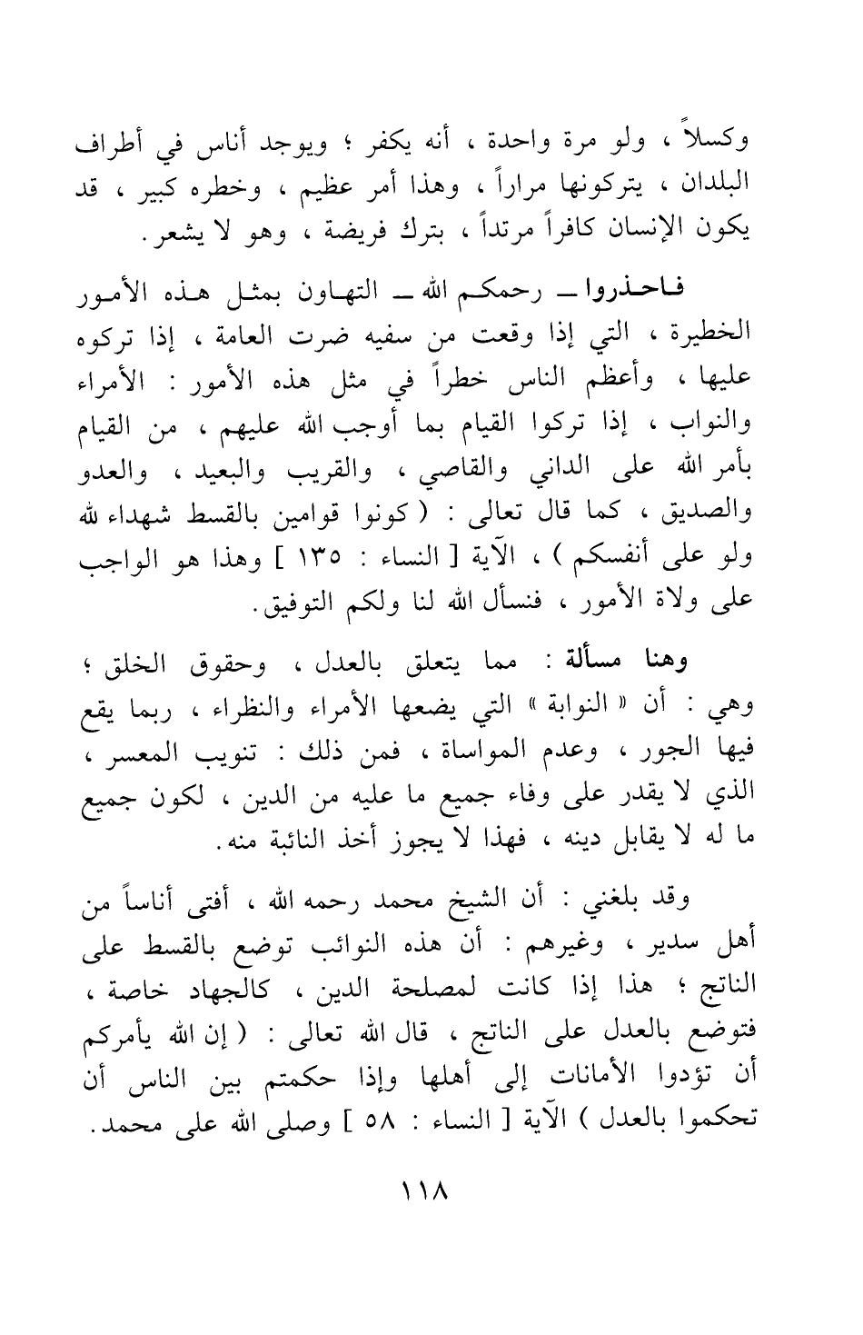 فاحذروا - رحمكم الله - التهاون بمثل هذه الأمور الخطيرة، التي إذا وقعت من سفيه ضرت العامة، إذا تركوه عليها وأعظم الناس خطرا في مثل هذه الأمور: الأمراء والنواب، إذا تركوا القيام بما أوجب الله عليهم، من القيام بأمر الله على الداني والقاصي، والقريب والبعيد، والعدو والصديق، كما قال تعالى {كُونُوا قَوَّامِينَ بِالْقِسْطِ شُهَدَاءَ لِلَّهِ وَلَوْ عَلَى أَنْفُسِكُمْ} : [سورة النساء آية: 135] الآية. وهذا هو الواجب على ولاة الأمور، فنسأل الله لنا ولكم التوفيق.