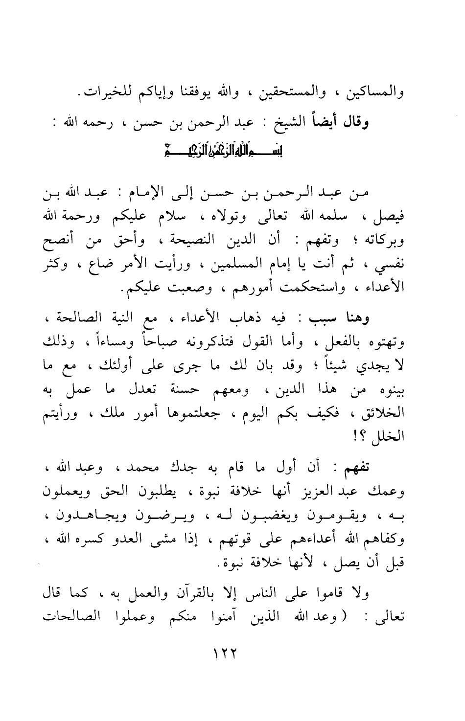 من عبد الرحمن بن حسن إلى الإمام: عبد الله بن فيصل، سلمه الله تعالى وتولاه، سلام عليكم ورحمة الله وبركاته; وتفهم أن الدين النصيحة، وأحق من أنصح نفسي، ثم أنت يا إمام المسلمين، ورأيت الأمر ضاع، وكثر الأعداء، واستحكمت أمورهم، وصعبت عليكم.