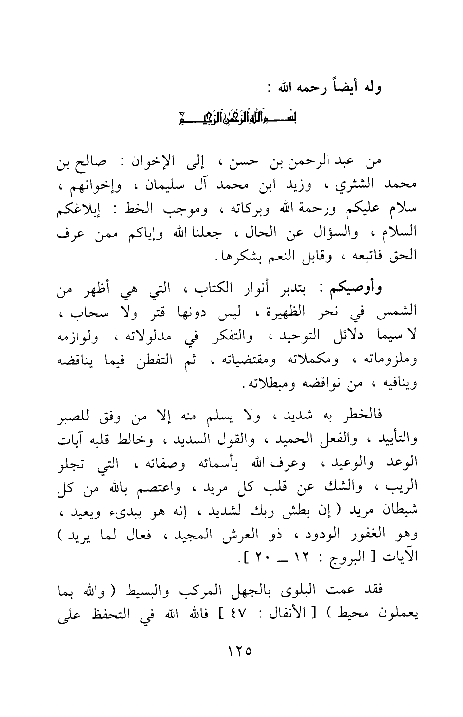 [رسالة الشيخ عبد الرحمن بن حسن إلى بعض الإخوان يسأل عن حالهم ويوصيهم بتدبر أنوار الكتاب]