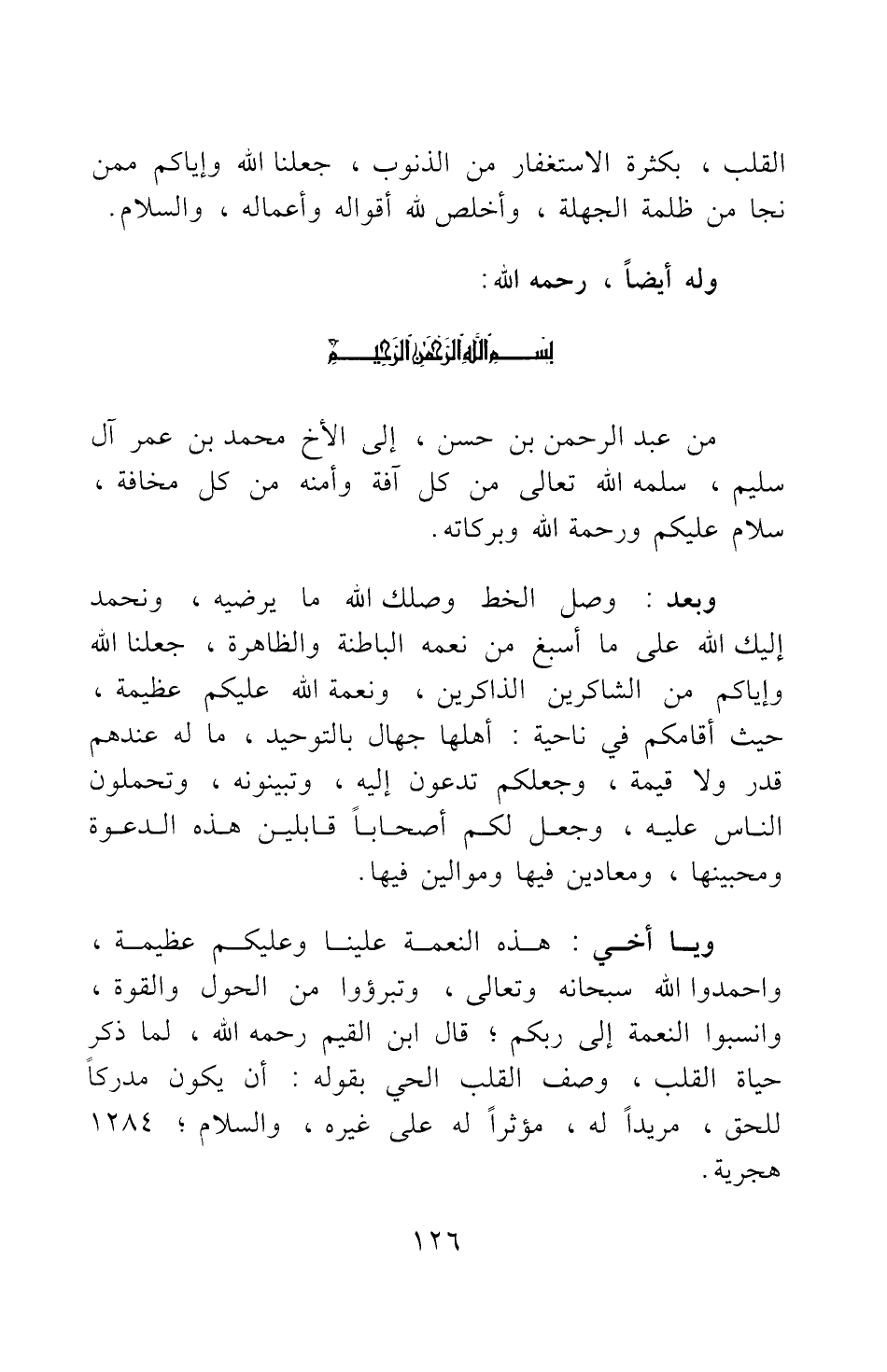 من عبد الرحمن بن حسن، إلى الأخ محمد بن عمر آل سليم، سلمه الله تعالى من كل آفة وأمنه من كل مخافة، سلام عليكم ورحمة الله وبركاته.