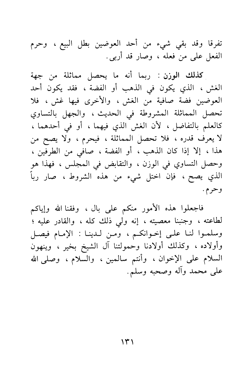 كذلك الوزن، ربما أنه ما يحصل مماثلة من جهة الغش الذي يكون في الذهب أو الفضة، فقد يكون أحد العوضين فضة صافية من الغش، والأخرى فيها غش، فلا تحصل المماثملة المشروطة في الحديث؛ والجهل بالتساوي كالعلم بالتفاضل، لأن الغش الذي فيهما، أو في أحدهما، لا يعرف قدره، فلا تحصل المماثلة، فيحرم؛ ولا يصح من هذا إلا إذا كان الذهب أو الفضة صافي من الطرفين، وحصل التساوي في الوزن، والتقابض في المجلس؛ فهذا هو الذي يصح، فإن اختل شيء من هذه الشروط، صار ربا وحرم.