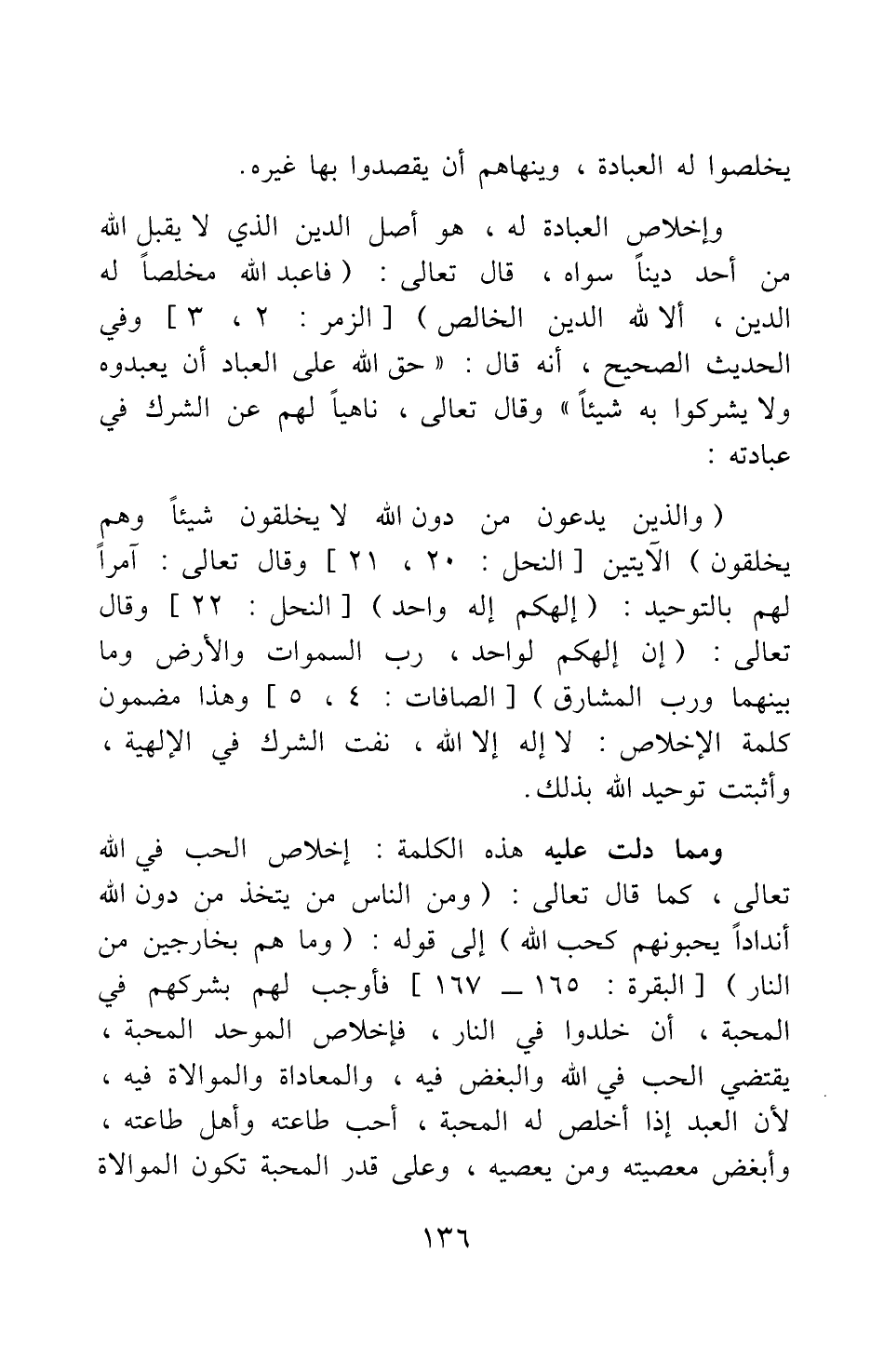 ومما دلت عليه هذه الكلمة: إخلاص الحب في الله تعالى، كما قال تعالى {وَمِنَ النَّاسِ مَنْ يَتَّخِذُ مِنْ دُونِ اللَّهِ أَنْدَاداً يُحِبُّونَهُمْ كَحُبِّ اللَّهِ} : [سورة البقرة آية: 165] إلى قوله: {وَمَا هُمْ بِخَارِجِينَ مِنَ النَّارِ} [سورة البقرة آية: 167] ، فأوجب لهم بشركهم في المحبة أن خلدوا في النار، فإخلاص الموحد المحبة يقتضي الحب في الله والبغض فيه، والمعاداة والموالاة فيه، لأن العبد إذا أخلص له المحبة أحب طاعته وأهل طاعته، وأبغض معصيته ومن يعصيه؛ وعلى قدر المحبة تكون الموالاة