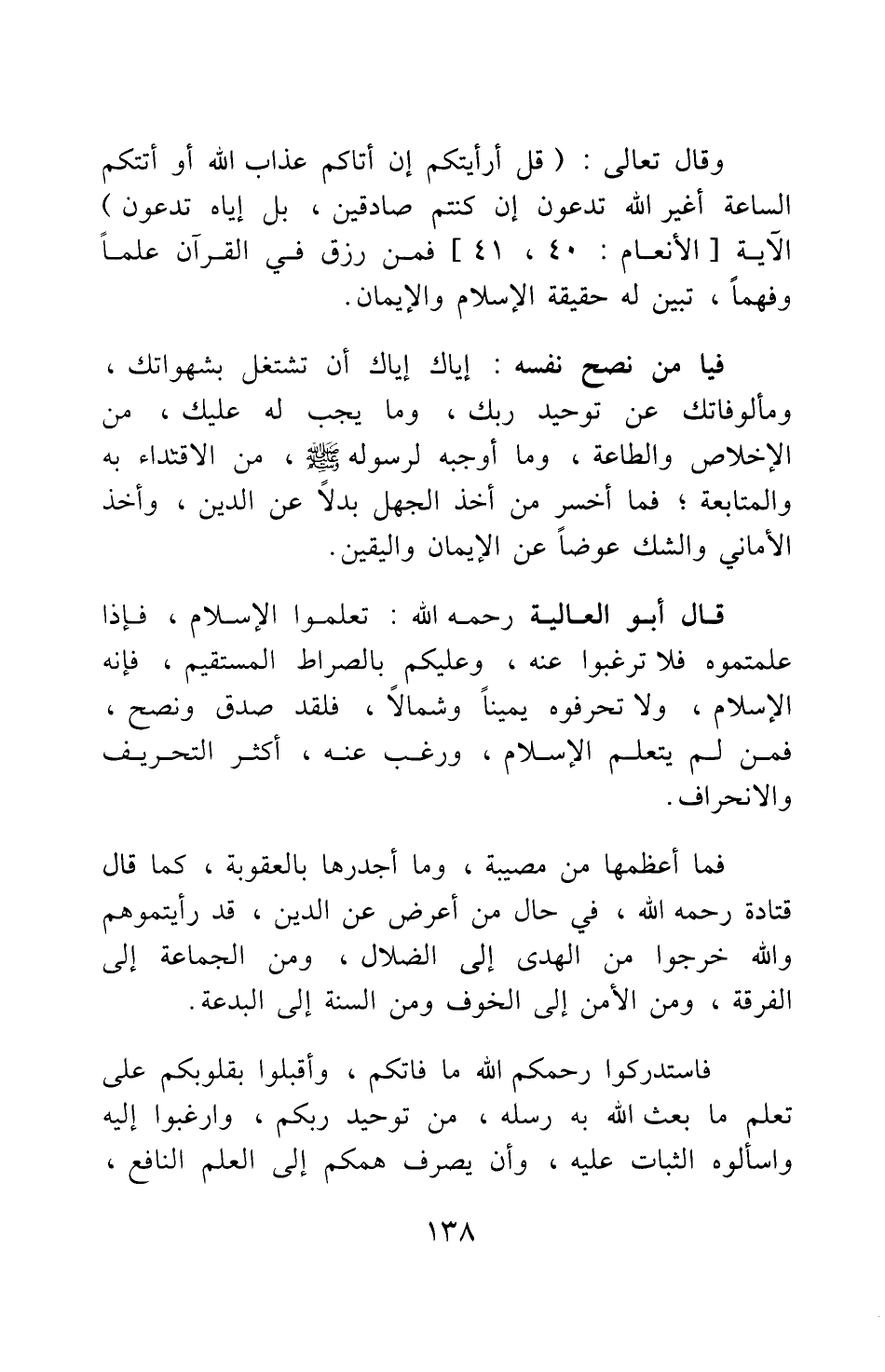 قال أبو العالية رحمه الله: تعلموا الإسلام، فإذا علمتموه فلا ترغبوا عنه. وعليكم بالصراط المستقيم، فإنه الإسلام، ولا تحرفوه يمينا وشمالا. فلقد صدق ونصح؛ فمن لم يتعلم الإسلام، ورغب عنه، أكثر التحريف والانحراف.