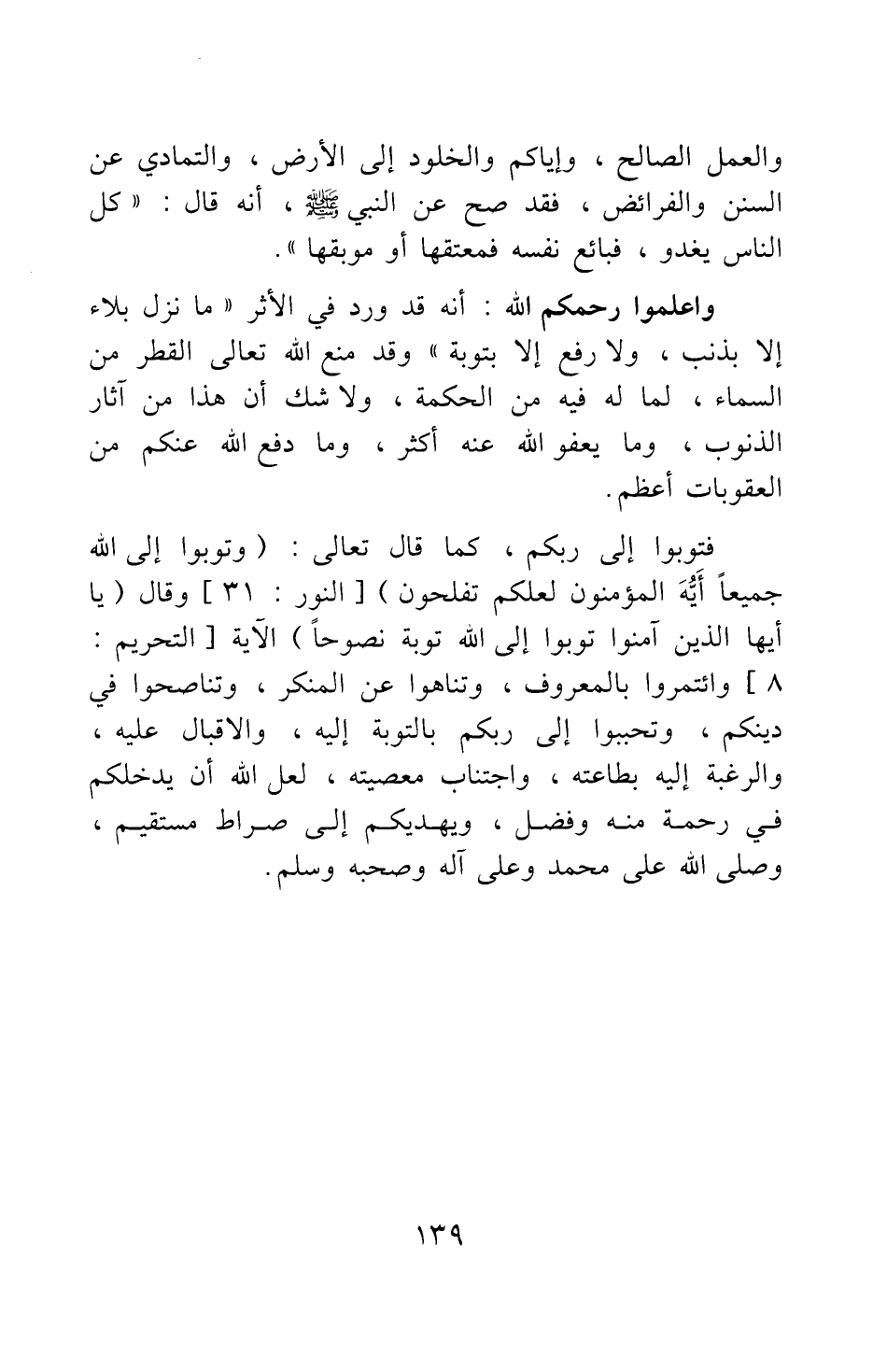 واعلموا رحمكم الله، أنه قد ورد في الأثر: ما نزل بلاء إلا بذنب، ولارفع إلا بتوبة وقد منع الله تعالى القطر من السماء، لما له فيه من الحكمة، ولا شك أن هذا من آثار الذنوب، وما يعفو الله عنه أكثر، وما دفع الله عنكم من العقوبات أعظم.
