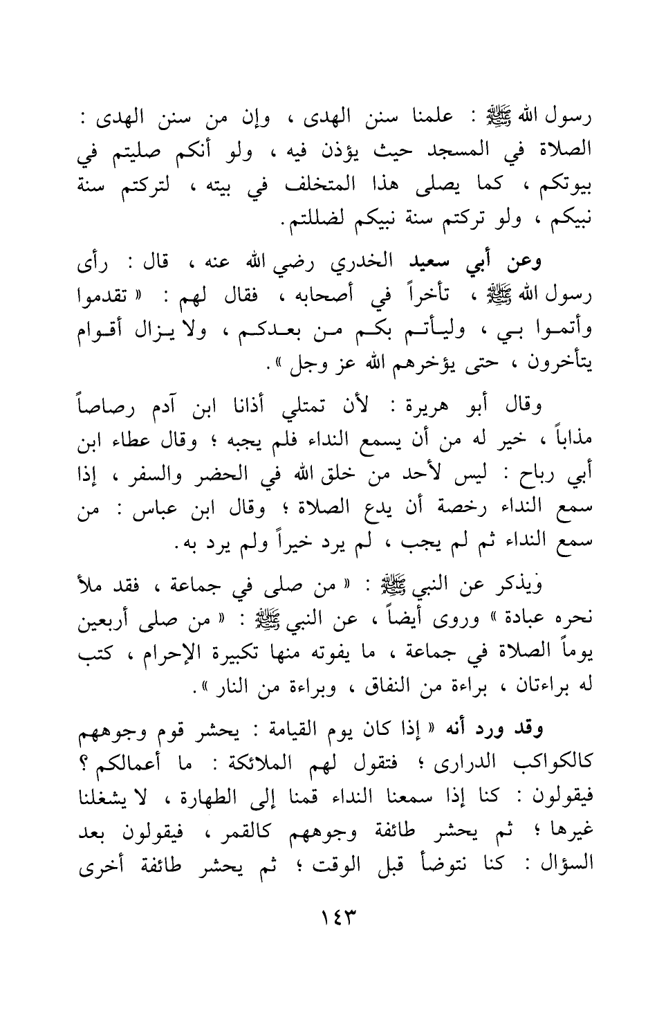 ويذكر عن النبي صلى الله عليه وسلم من صلى في جماعة، فقد ملأ نحره عبادة. وروى أيضا عن النبي صلى الله عليه وسلم: من صلى أربعين يوما الصلاة في جماعة، ما يفوته منها تكبيرة الإحرام، كتب له براءتان: براءة من النفاق، وبراءة من النار.