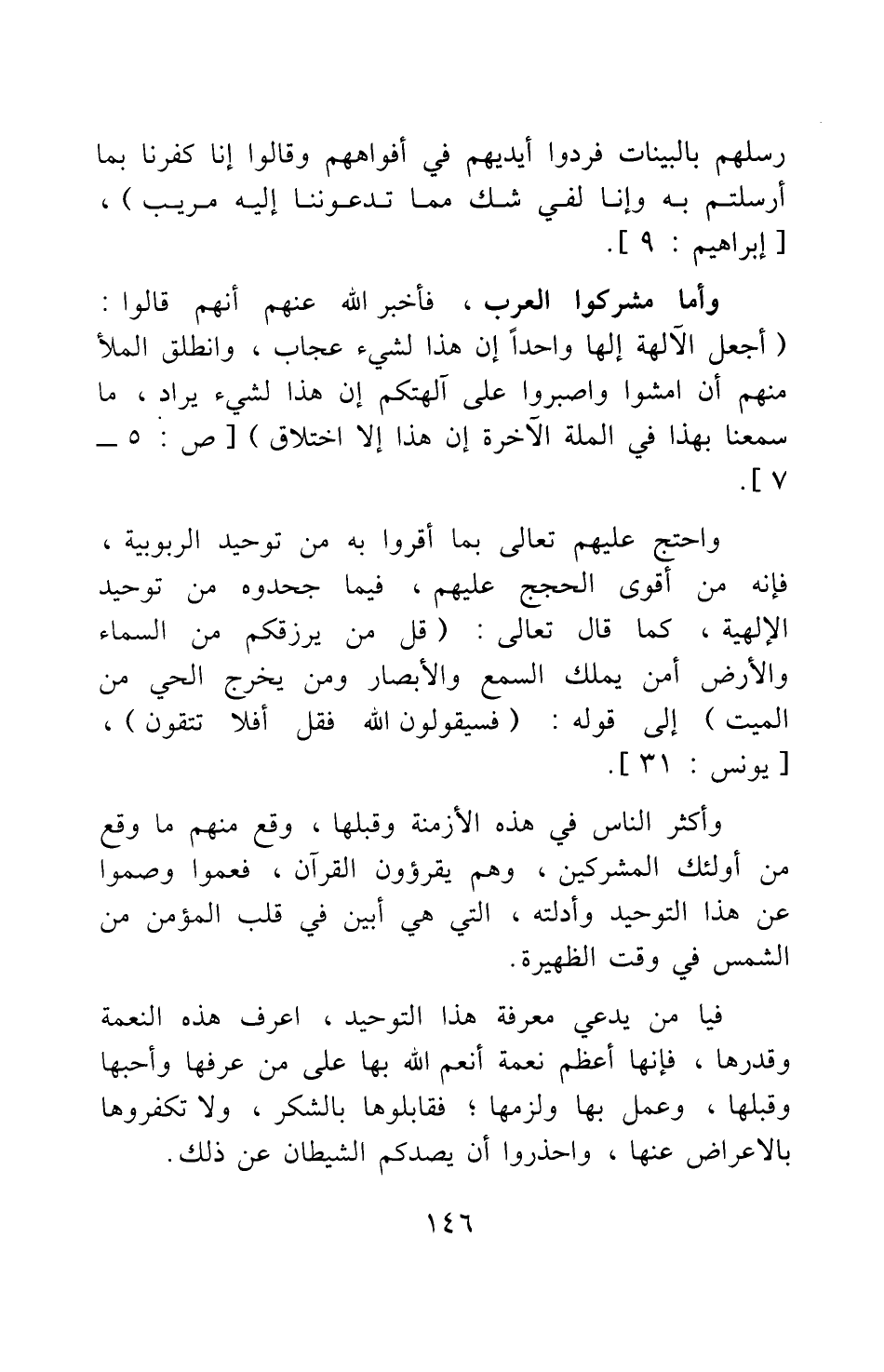 فيا من يدعي معرفة هذا التوحيد، اعرف هذه النعمة وقدرها، فإنها أعظم نعمة أنعم الله بها على من عرفها وأحبها وقبلها، وعمل بها ولزمها; فقابلوها بالشكر، ولا تكفروها بالإعراض عنها، واحذروا أن يصدكم الشيطان عن ذلك.