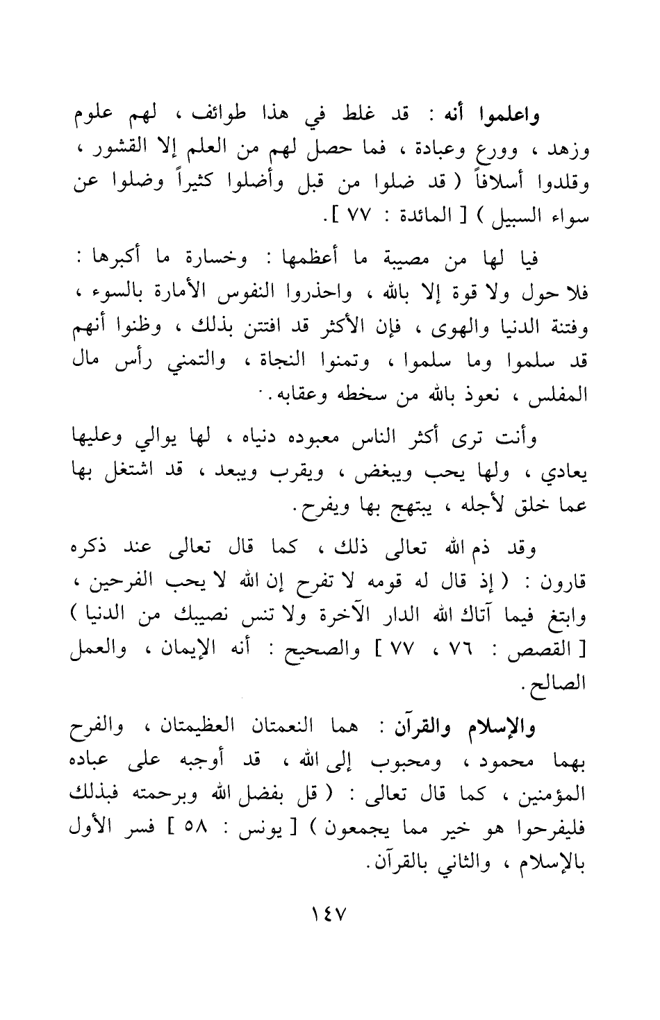 والإسلام والقرآن هما النعمتان العظيمتان، والفرح بهما محمود، ومحبوب إلى الله، قد أوجبه على عباده المؤمنين، كما قال تعالى {قُلْ بِفَضْلِ اللَّهِ وَبِرَحْمَتِهِ فَبِذَلِكَ فَلْيَفْرَحُوا هُوَ خَيْرٌ مِمَّا يَجْمَعُونَ} [سورة يونس آية: 58] ، فسر الأول بالإسلام، والثاني بالقرآن.